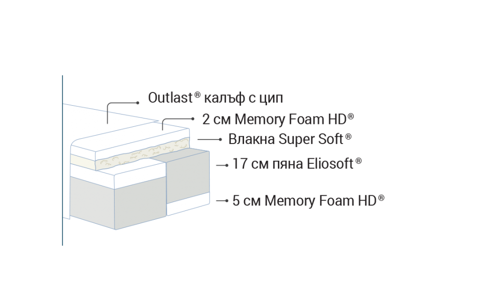 Comfort Dual се отличава с Memory Foam HD® в текстила (2 см) и в ядрото (5 см) - мемори пяна, която първо реагира на натиск, а после на топлина - особено важно в зимните месеци, когато температурата в помещението е по-ниска. При матраците на Magniflex с Memory Foam HD® ще усетите отпускане веднага след като легнете. Този материал разпределя равномерно тежестта на тялото, което облекчава раменете, кръста и краката Ви.