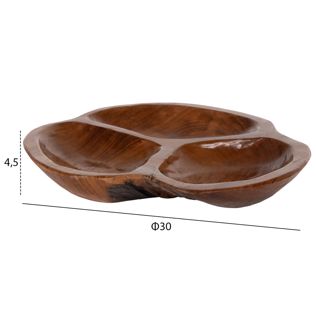 Εάν θέλετε να διακοσμήσετε το τραπέζι σας με ένα όμορφο και πρακτικό χειροποίητο κομμάτι, το КГ4272 είναι μια χαρακτηριστική επιλογή. Πρόκειται για έναν σχεδόν στρογγυλό ξύλινο δίσκο για ξηρούς καρπούς 3 θέσεων, στο φυσικό χρώμα του ξύλου, που σίγουρα θα τραβήξει τα βλέμματα. ΔΙΑΣΤΑΣΕΙΣ: Φ30x4,5Υ εκ.---*Οι διαστάσεις είναι ενδεικτικές. Μπορεί να υπάρχουν διαφορές στις διαστάσεις του προϊόντος λόγω των διαστάσεων του επεξεργασμένου ξύλου. ΥΛΙΚΑ ΚΑΤΑΣΚΕΥΗΣ: Ο δίσκος είναι κατασκευασμένος από μονοκόμματο μασίφ ξύλο ΤΕΑΚ. Το ΤΕΑΚ είναι ο πιο δημοφιλής τύπος σκληρού ξύλου. Είναι χρώματος κίτρινο έως σκούρο καφέ, εξαιρετικά βαρύ, υψηλής αντοχής, ανθεκτικό στις καιρικές συνθήκες, ανθεκτικό στο σκέβρωμα και δεν αποσυντίθεται. Συχνά, τα νερά του ξύλου του είναι έντονα και σε ευθεία. Χρησιμοποιείται για πληθώρα κατασκευών εσωτερικού αλλά και εξωτερικού χώρου. ΣΥΝΤΗΡΗΣΗ: Το γεγονός ότι το ΤΕΑΚ περιλαμβάνεται στα σκληρά ξύλα, το κάνει πολύ εύκολο στην συντήρησή του. Το μόνο που χρειάζεται είναι ένα ξεσκόνισμα και όταν χρειαστεί ένα καθάρισμα με ένα υγρό πανάκι.