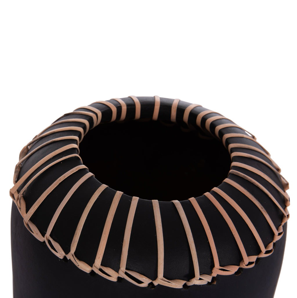 Ръчно изработената настолна декоративна ваза LENNOX е красив декоративен елемент за всяко пространство. Изработена е изцяло от теракота в ЧЕРЕН цвят, а гърлото е декорирано с плетка от естествен ратан. Идеален за множество приложения и пространства. РАЗМЕРИ: Φ18x33H см. СТРОИТЕЛНИ МАТЕРИАЛИ: Основният строителен материал е теракот. Теракотата е керамичен материал. Името му идва от латински и означава "видима почва" (terra = почва, пръст и cotta = видима, изпечена). Затова, когато казваме, че нещо е направено от теракот, имаме предвид, че е направено от глина. ПОДДРЪЖКА: Едно почистване с прах обикновено е достатъчно, но избягвайте използването на химически почистващи препарати. ** Цветопредаването на продукта може леко да се различава от неговото фотографско представяне на вашия екран.