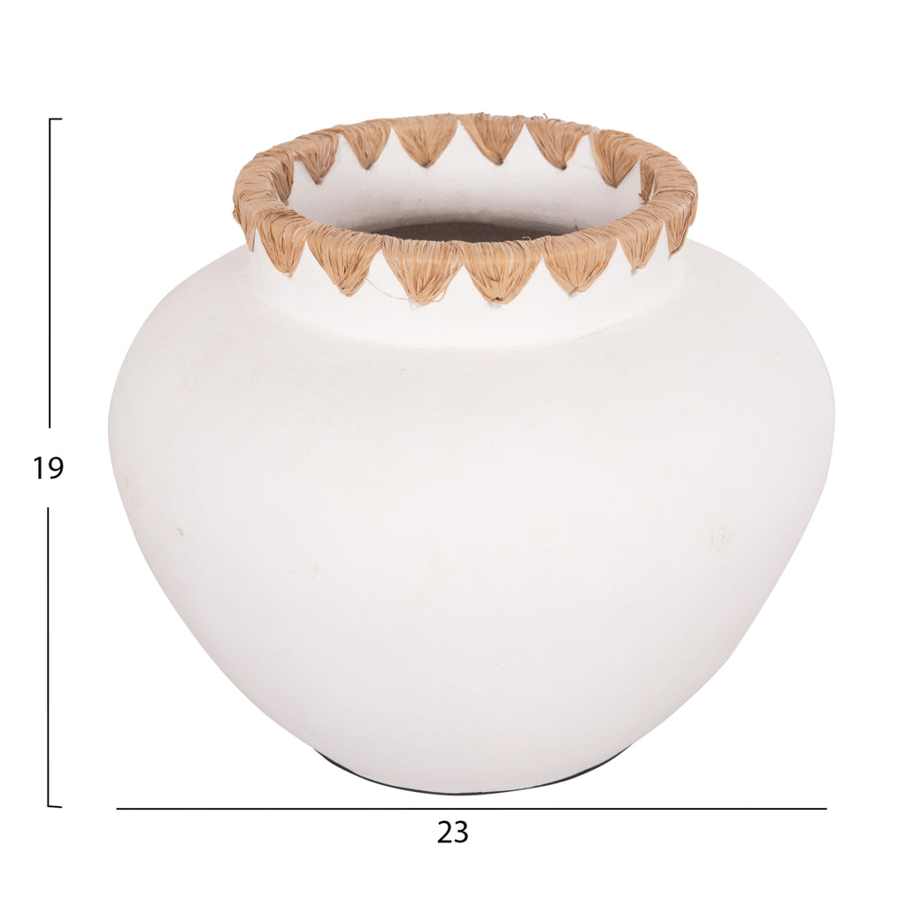 Декоративната ваза RENTON(S) е широка с голямо гърло с тъкана подложка. Той е в БЯЛ нюанс и може да се съчетае навсякъде, където пожелаете. Или у дома, или в бизнес помещения. РАЗМЕРИ: Φ23x19H см. Устие: Φ15 см. СТРОИТЕЛНИ МАТЕРИАЛИ: Строителният материал е теракот. Теракотата е керамичен материал. Името му идва от латински и означава "видима почва" (terra = почва, пръст и cotta = видима, изпечена). Затова, когато казваме, че нещо е направено от теракот, имаме предвид, че е направено от глина. ПОДДРЪЖКА: Едно почистване с прах обикновено е достатъчно. Ако искате, можете да го измиете с вода, но избягвайте използването на химически почистващи препарати. ** Цветопредаването на продукта може леко да се различава от неговото фотографско представяне на вашия екран.