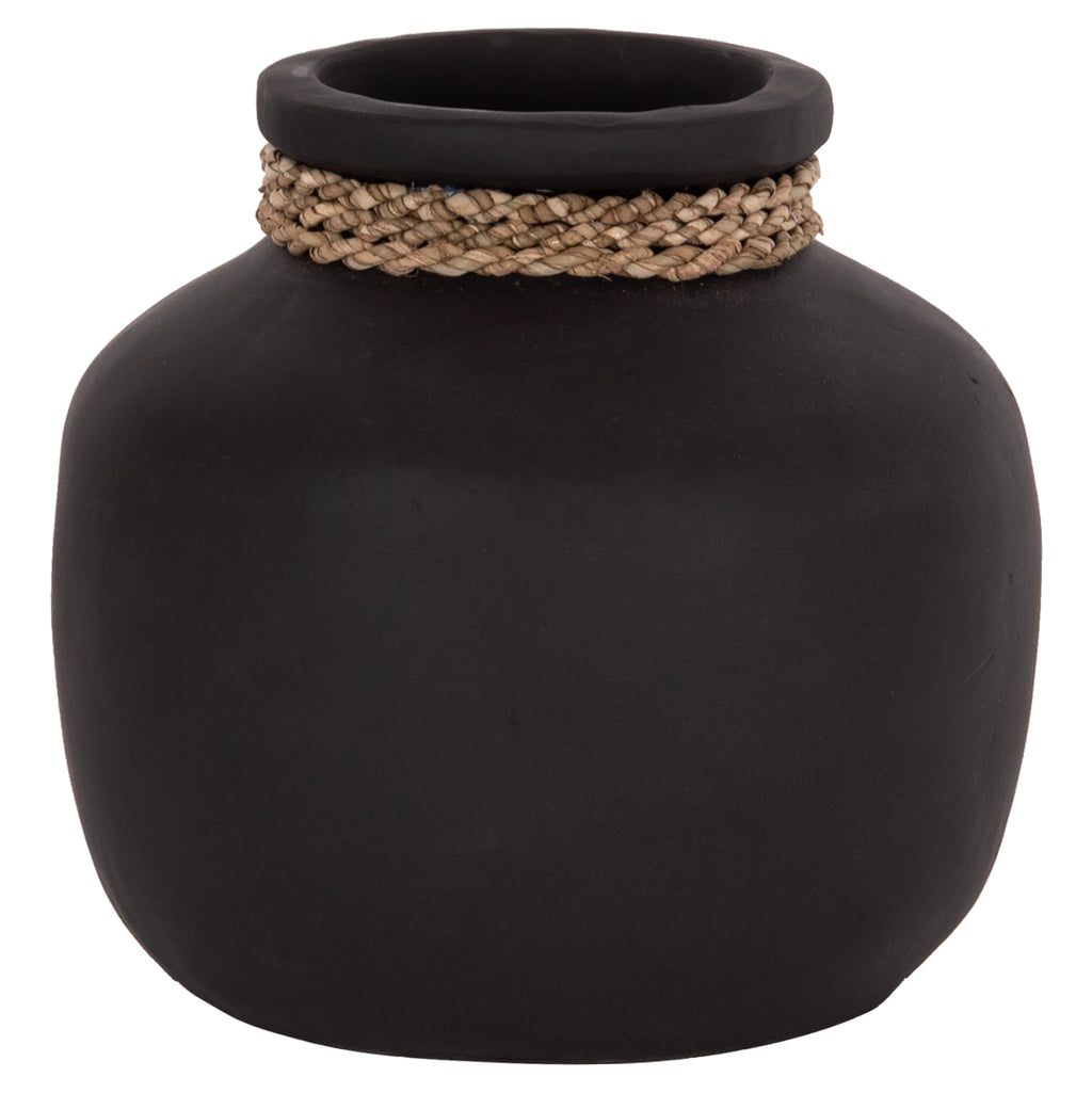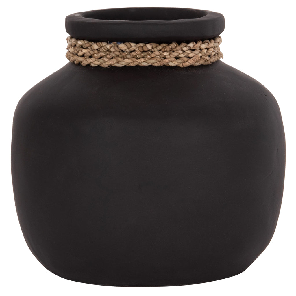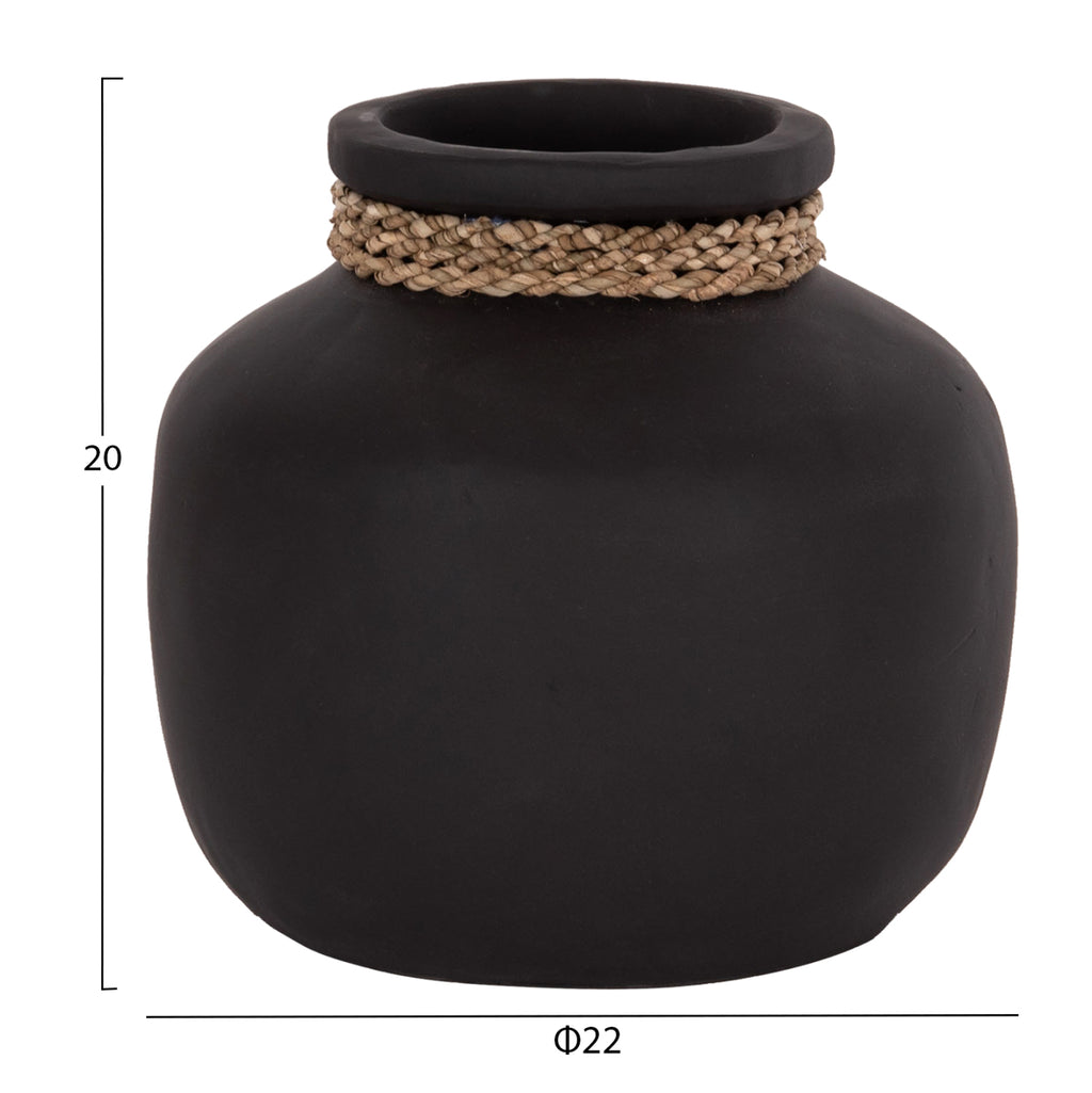 Настолната ръчно изработена декоративна ваза CAMMER е изработена изцяло от теракота в ЧЕРЕН цвят, като около "гърлото" на вазата има декоративна ратанова плетка. Идеален за различни пространства, както за дома, така и за професионални пространства. РАЗМЕРИ: Φ22x20H см. Устие: Φ9 см. СТРОИТЕЛНИ МАТЕРИАЛИ: Строителният материал е теракот. Теракотата е керамичен материал. Името му идва от латински и означава "видима почва" (terra = почва, пръст и cotta = видима, изпечена). Затова, когато казваме, че нещо е направено от теракот, имаме предвид, че е направено от глина. ПОДДРЪЖКА: Едно почистване с прах обикновено е достатъчно, но избягвайте използването на химически почистващи препарати. ** Цветопредаването на продукта може леко да се различава от неговото фотографско представяне на вашия екран.