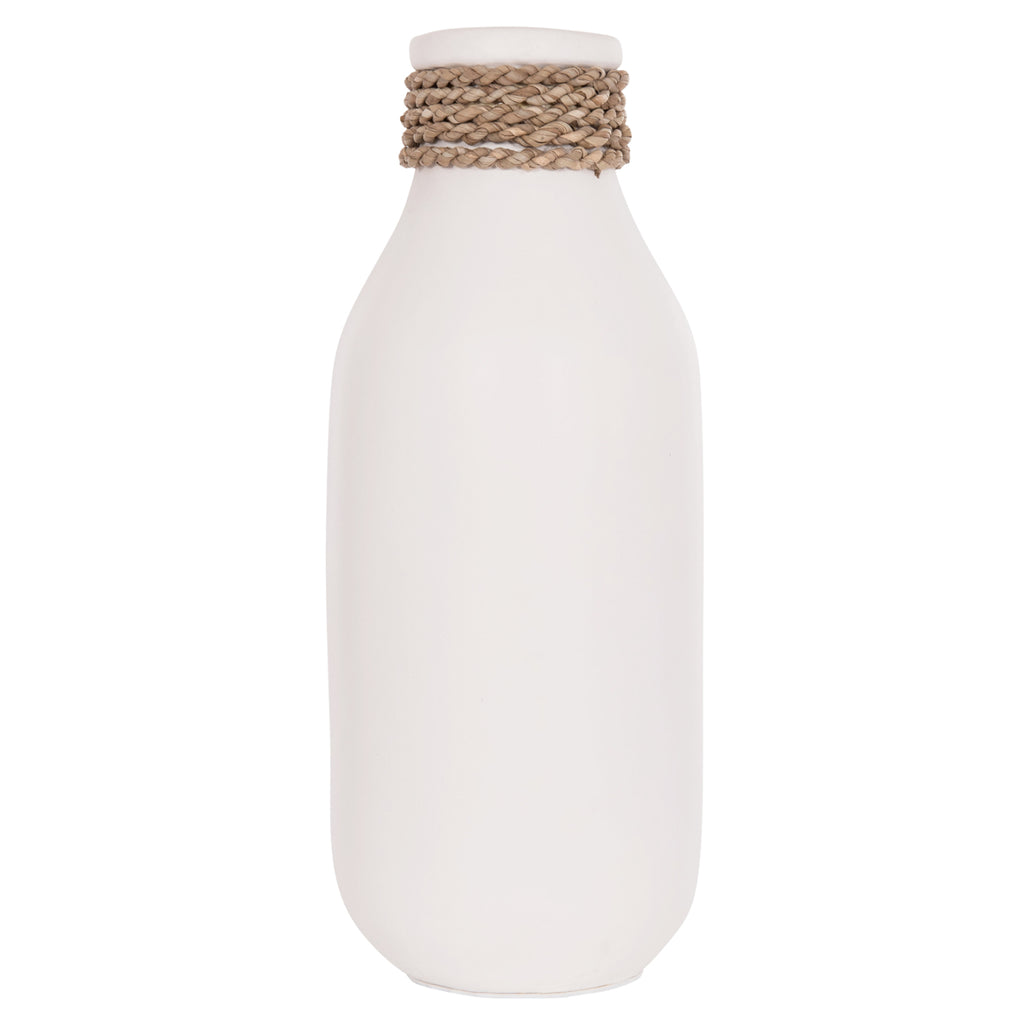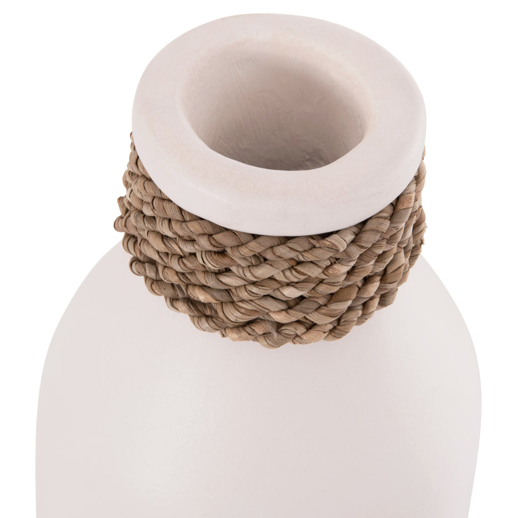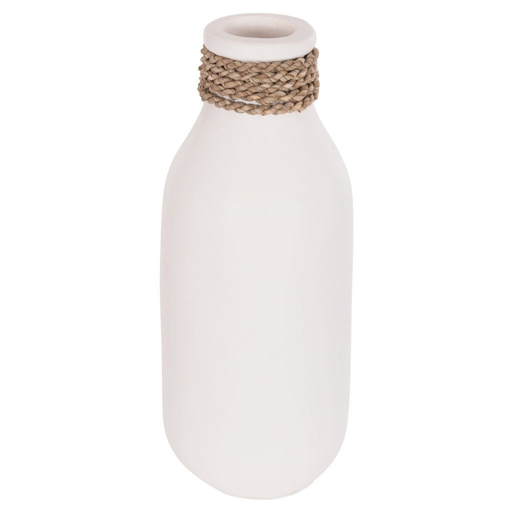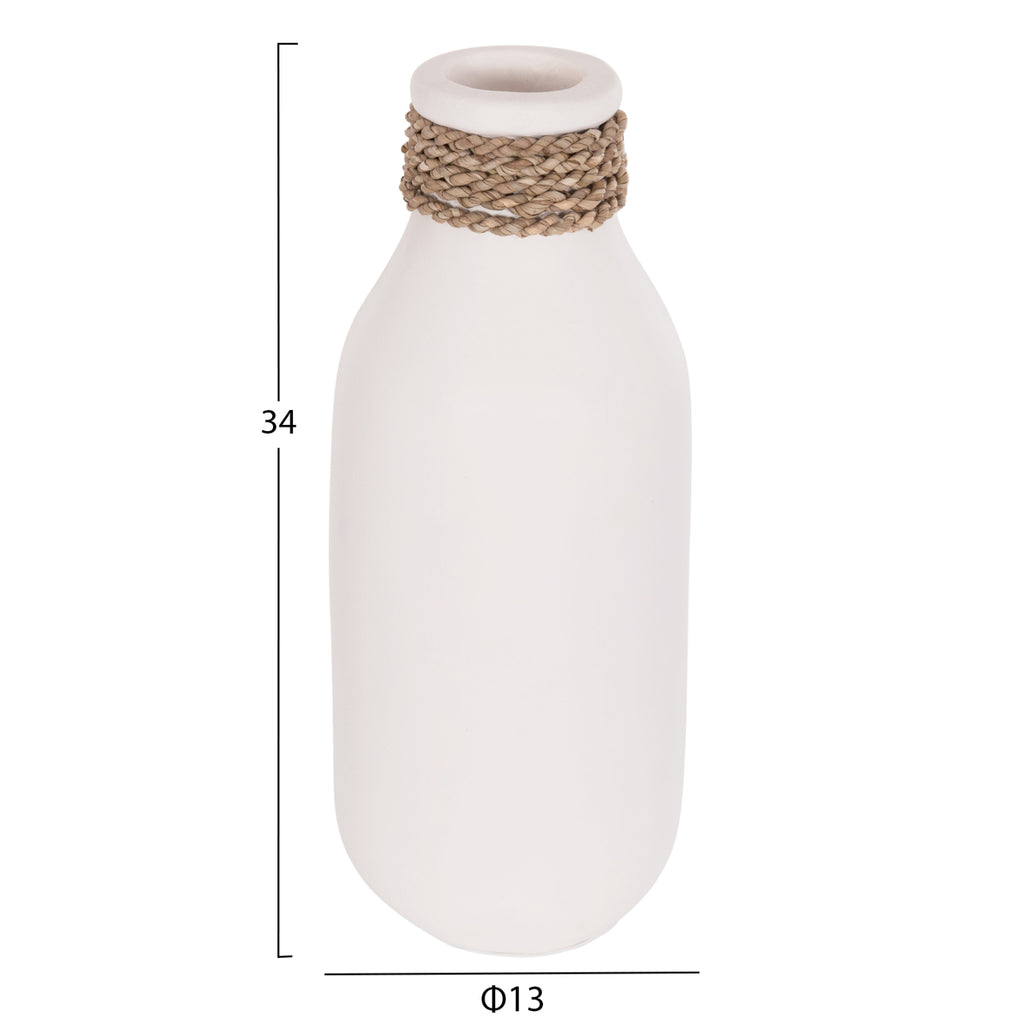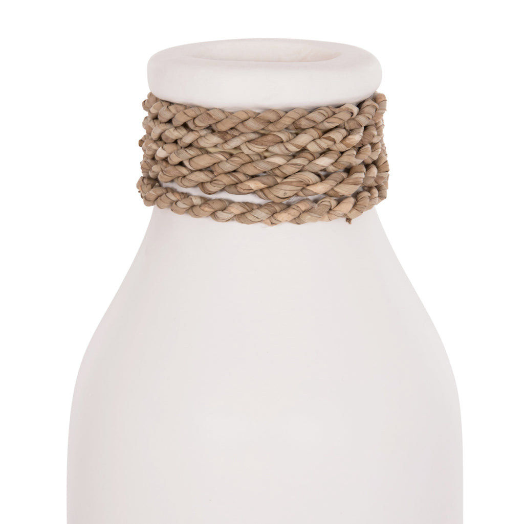 Настолната ръчно изработена декоративна ваза CAMMER е във форма на бутилка и е изработена изцяло от теракот в БЯЛ цвят и има декоративна ратанова плетка в "гърлото" точно под чучура. Идеален за различни пространства, както за дома, така и за професионални пространства. РАЗМЕРИ: Φ13x34H см. Устие: Φ5 см. СТРОИТЕЛНИ МАТЕРИАЛИ: Строителният материал е теракот. Теракотата е керамичен материал. Името му идва от латински и означава "видима почва" (terra = почва, пръст и cotta = видима, изпечена). Затова, когато казваме, че нещо е направено от теракот, имаме предвид, че е направено от глина. ПОДДРЪЖКА: Едно почистване с прах обикновено е достатъчно, но избягвайте използването на химически почистващи препарати. ** Цветопредаването на продукта може леко да се различава от неговото фотографско представяне на вашия екран.