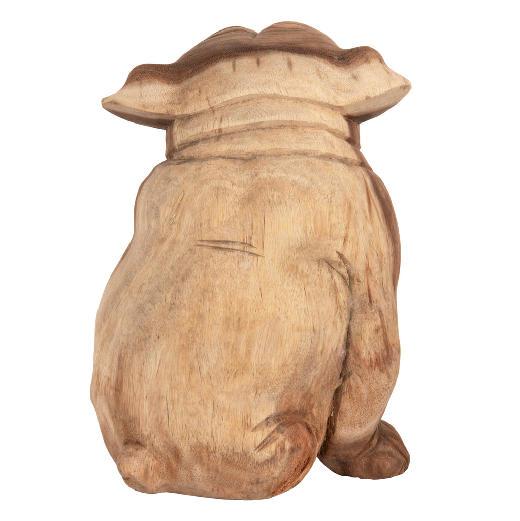 Подовият орнамент DOZER BULLDOG е красиво парче дърво, издълбано с детайли. Формата е на (куче) булдог в ЕСТЕСТВЕНИЯ цвят на дървото. Тази декорация със сигурност ще привлече окото и е идеална както за дома, така и за бизнес помещения. РАЗМЕРИ: 20х17х30Н см. Съществуващите пукнатини или тези, които могат да се образуват с течение на времето се дължат на свиването-разширяването на живия организъм, наречен масивна дървесина, а не са производствен дефект, придавайки оригиналност и уникален дизайн на вашето пространство. По време на производствения процес съществуващите пукнатини се изглаждат и стабилизират с материал от същата дървесина. Поради това може да има цветови вариации и разлики в размерите на продукта поради размерите на обработената дървесина. Това не са дефект на продукта. МАТЕРИАЛИ НА ИЗРАБОТКА: Декорацията е от масивно SUAR дърво. Когато говорим за масивно дърво, имаме предвид дървета, направени изцяло от ствола на дърво. Масивната дървесина е най-скъпият избор по отношение на дървесината, но се откроява със своята вечна естетика. Suar wood е дървесината на дървото Albizia Saman, понякога наричано дъждовно дърво, дърво, произхождащо от Южна Америка. Това дърво е въведено в Индонезия като плантационно дърво. Дървесината е известна под много различни имена, включително Monkeypod, Samenes Saman, Parota, South American Walnut и Acadia, както и Suar Wood. Това е красиво добре оформено дърво, с много пресичащи се "води". "Сърцевината" на дървото е близка до цвета на ореха, докато останалата част от тялото на дървото е по-светла на цвят. Всяко парче суарско дърво, както всяка снежинка, е уникално. Зърнистостта на дървото може да варира значително, правейки едно парче да изглежда по-желано за един конкретен клиент от друго. Правилно изсушено, суровото дърво е много здраво и издръжливо. ПОДДРЪЖКА: Издръжливостта на това дърво е такава, че може лесно да се почиства с влажна кърпа.