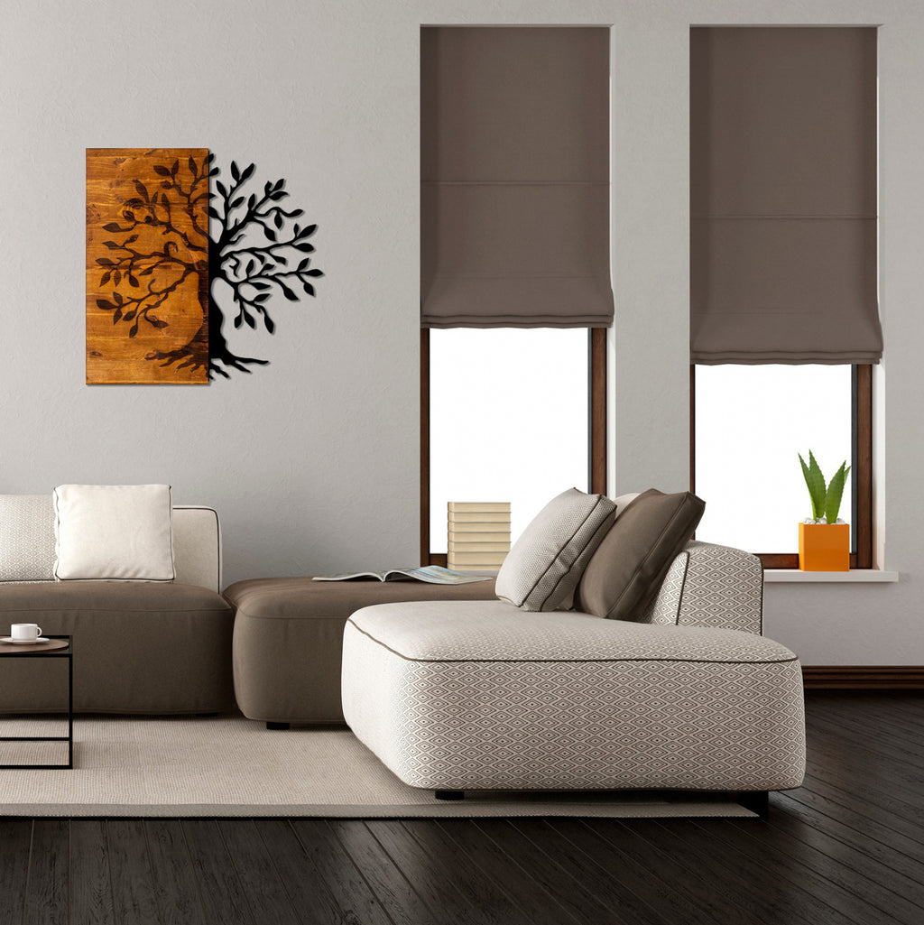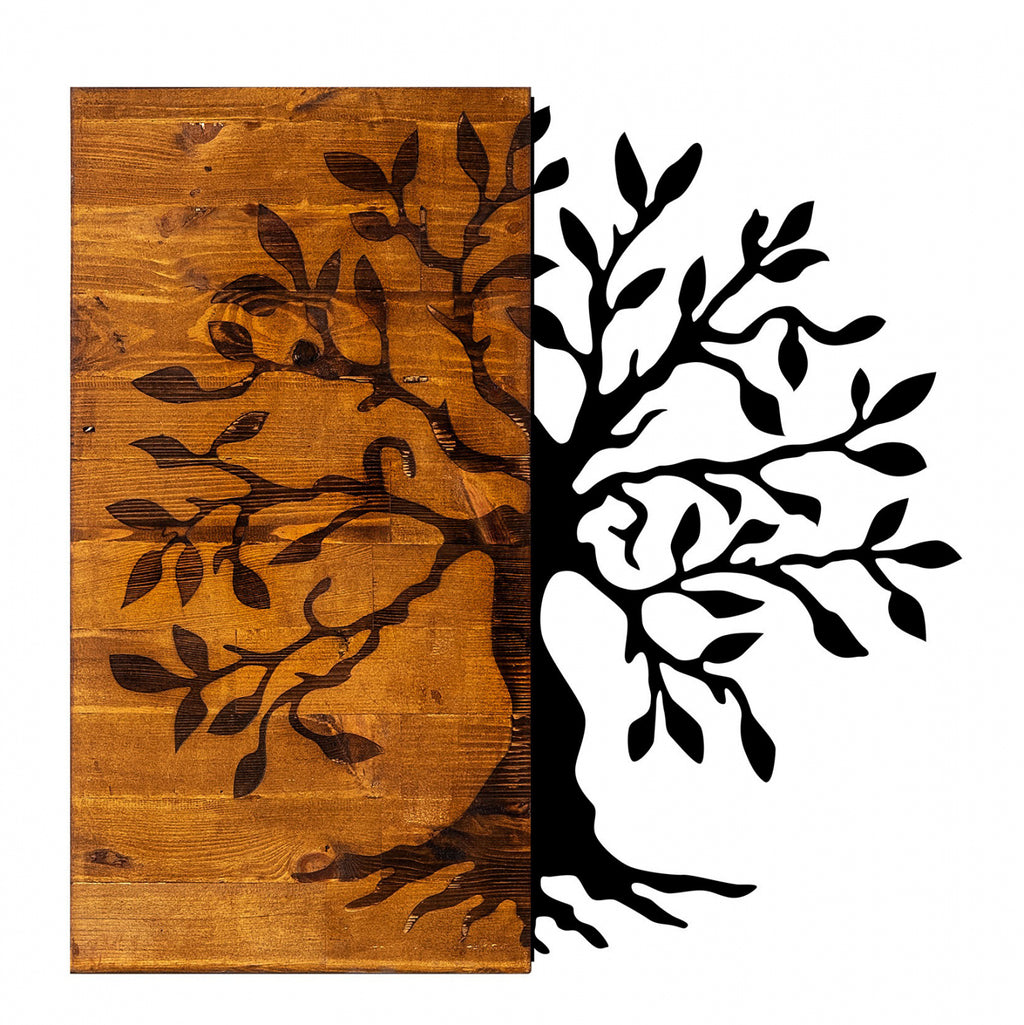 Декорацията на едно пространство е особено важна, тъй като тя "издава" нашата естетика и индивидуалност. Стенната декорация привлича вниманието на хората в стаята, така че трябва да включва стилни предмети. Тази специална конструкция от метал в комбинация с масивно дърво е идеалната декорация за стената на вашия дом или бизнес. Нейният дизайн е дърво в черен нюанс, половината от който е върху естествен нюанс на дърво. Подходящ за всички части на дома или на работното място и брилянтна идея за подарък! Характеристики на продукта: Декорация за стена Материал: Масивно дърво 50% и метал 50% Цвят: Естествен и черен Размери: 58x58cm Дебелина: 3cm. Европейско производство и произход. Продуктът се предлага във фабрична опаковка.