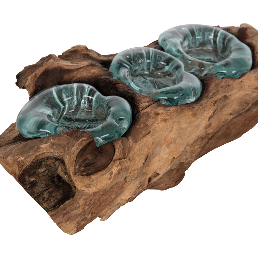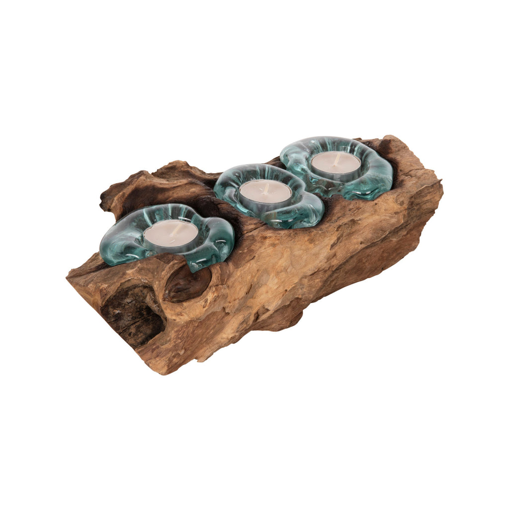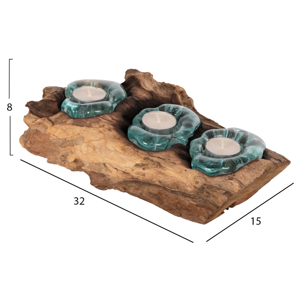 Декорацията за маса КГ4282 е поставка за 3 тикови свещи от масивно ТИКОВО дърво. Основите за резо са изработени от стъкло. Почитателите на рустик стила в декорирането ще се зарадват на това предложение. РАЗМЕРИ: 32x15x8Y см. (ориентировъчни размери, тъй като всяко парче е с неправилна форма и размер) *Поради спецификата на масивната дървесина изображението и размерите може да се различават при всеки продукт. МАТЕРИАЛИ НА ИЗРАБОТКА: Декорацията е от масивно тиково дърво. Когато говорим за масивно дърво, имаме предвид дървета, направени изцяло от ствола на дърво. Масивната дървесина е най-скъпият избор по отношение на дървесината, но се откроява със своята вечна естетика. Тикът е най-популярният вид твърда дървесина. Той е жълт до тъмно кафяв на цвят, изключително тежък, с висока якост, устойчив на атмосферни влияния, устойчив на стружки и не се разлага. Често водите на дървото му са силни и прави. Използва се за много вътрешни и външни конструкции. ПОДДРЪЖКА: Фактът, че ТИК е част от твърдата дървесина, го прави много лесен за поддръжка. Всичко, от което се нуждае, е почистване от прах и при необходимост почистване с влажна кърпа. ПРЕДИМСТВА: Тази декорация може да се побере навсякъде, където пожелаете. Или у дома, или в бизнес помещения.