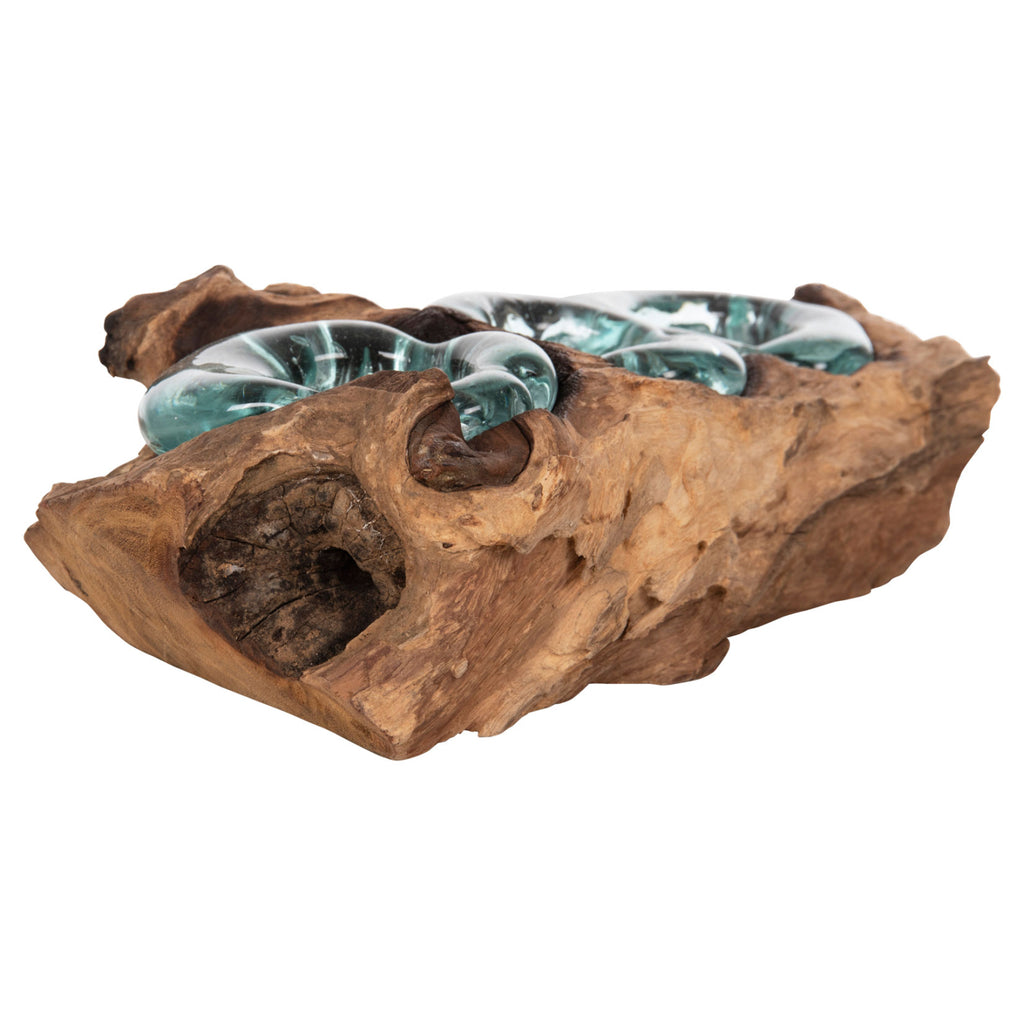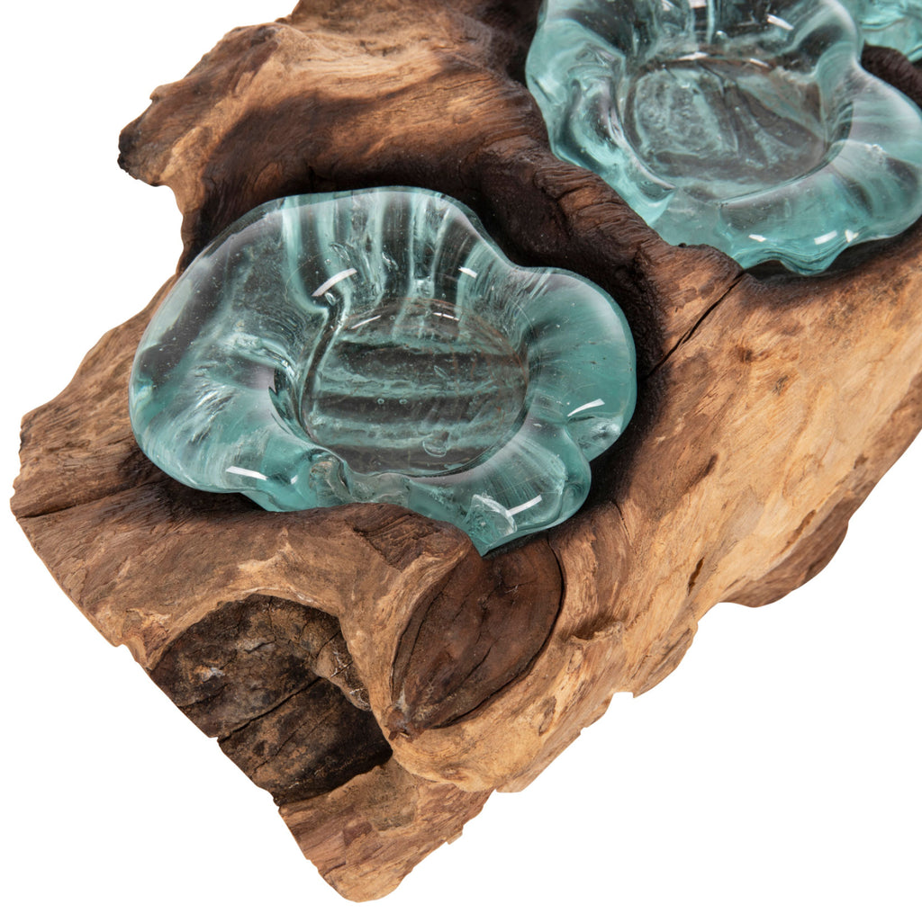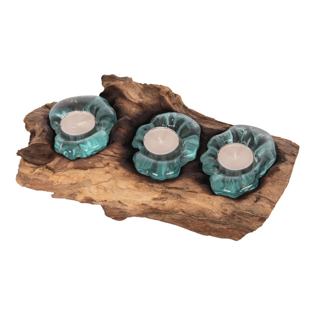 Декорацията за маса КГ4282 е поставка за 3 тикови свещи от масивно ТИКОВО дърво. Основите за резо са изработени от стъкло. Почитателите на рустик стила в декорирането ще се зарадват на това предложение. РАЗМЕРИ: 32x15x8Y см. (ориентировъчни размери, тъй като всяко парче е с неправилна форма и размер) *Поради спецификата на масивната дървесина изображението и размерите може да се различават при всеки продукт. МАТЕРИАЛИ НА ИЗРАБОТКА: Декорацията е от масивно тиково дърво. Когато говорим за масивно дърво, имаме предвид дървета, направени изцяло от ствола на дърво. Масивната дървесина е най-скъпият избор по отношение на дървесината, но се откроява със своята вечна естетика. Тикът е най-популярният вид твърда дървесина. Той е жълт до тъмно кафяв на цвят, изключително тежък, с висока якост, устойчив на атмосферни влияния, устойчив на стружки и не се разлага. Често водите на дървото му са силни и прави. Използва се за много вътрешни и външни конструкции. ПОДДРЪЖКА: Фактът, че ТИК е част от твърдата дървесина, го прави много лесен за поддръжка. Всичко, от което се нуждае, е почистване от прах и при необходимост почистване с влажна кърпа. ПРЕДИМСТВА: Тази декорация може да се побере навсякъде, където пожелаете. Или у дома, или в бизнес помещения.
