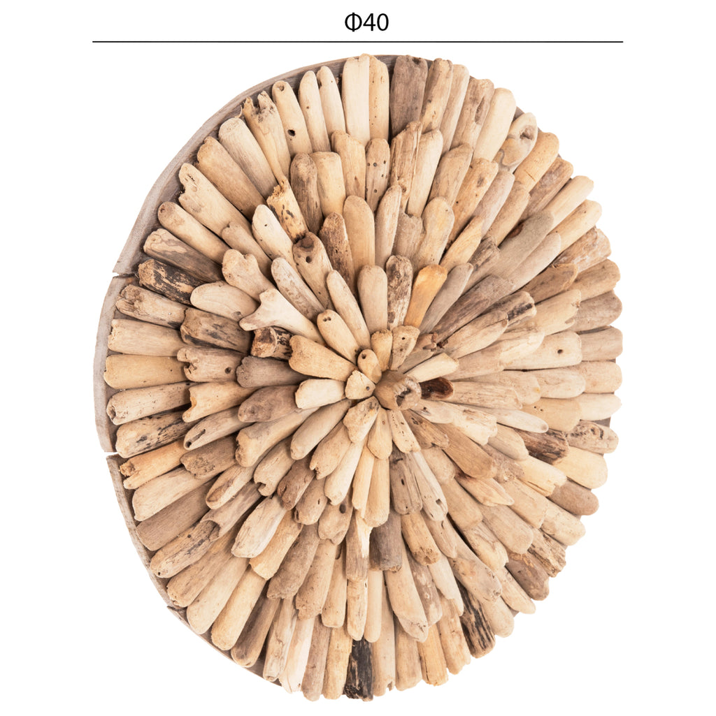 Искате ли да се откроите, като поставите нещо уникално във вашето пространство? Не се колебайте да украсите стената си със стилно произведение на изкуството. CHIIKI е кръгъл диск, съставен от няколко парчета дърво, разположени симетрично. Тази табла ще осигури фокусна точка във вашата всекидневна или във всяко пространство, което искате да поставите, професионално или не, магнетизирайки очите на посетителите и придавайки характер на пространството. РАЗМЕРИ: Φ40см. МАТЕРИАЛ НА ИЗРАБОТКА: Тази декорация за стена е изработена от наплавено дърво. Това са парчета дърво, изхвърлени на брега или плажа на море, езеро или река от действието на ветрове, приливи или вълни. Тези части се събират и обработват, за да се използват за различни цели. ПОДДРЪЖКА: Редовното почистване на прах ще запази вашата декорация като нова.