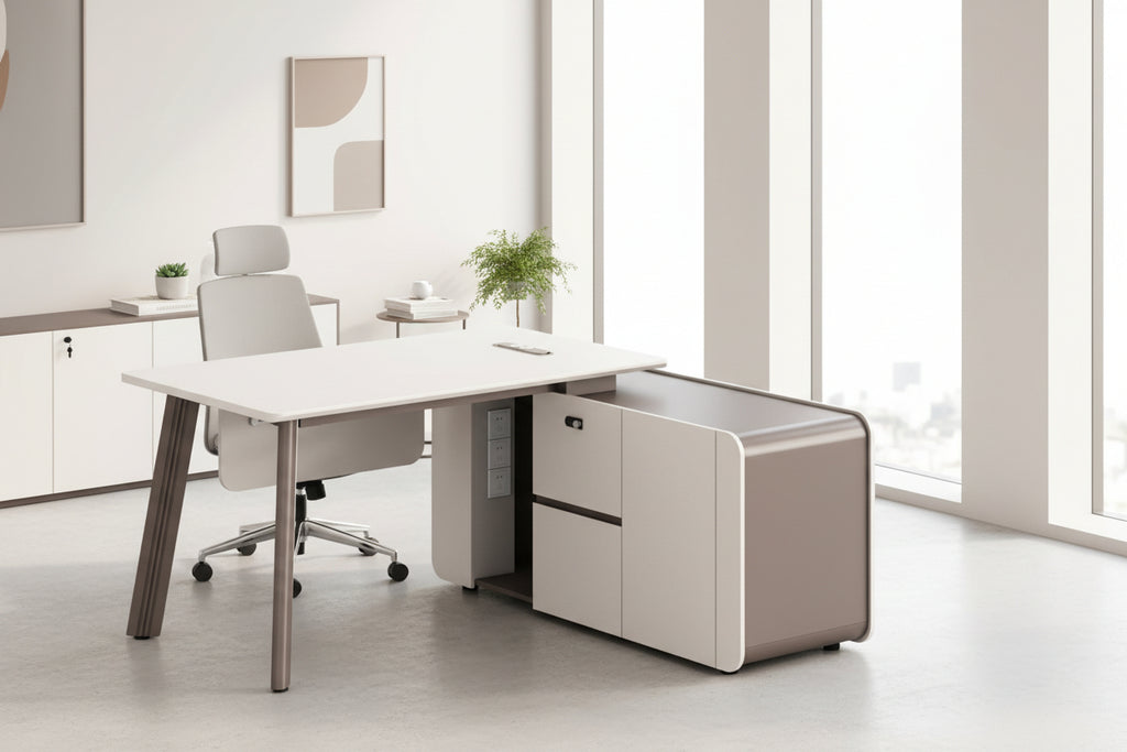 Характеристики на продукта • Професионално бюро с десен ъгъл • Меламин в екрю и светлокафяво • 2 алуминиеви крака в светлокафяво • Овална повърхност с отвор за управление на кабели • Ъглов шкаф без рафтове • Чекмедже с 3-цифрена кодова ключалка • Дълбоко чекмедже със скрита дръжка • Отворено пространство с готови за монтаж контакти