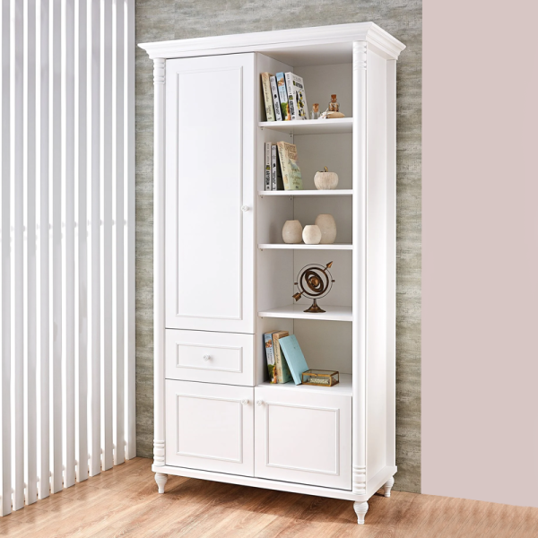 Детска етажерка за книги NIL може да се адаптира към всеки интериор със своя стилен и функционален дизайн. В класически бял цвят и елегантна визия, тази библиотека предлага минималистичен и изчистен вид. Има четири отворени рафта от дясната страна, който осигуряват достатъчно място за излагане на вашите книги, декоративни предмети, сувенири или картини в рамки. В лявата част с вратичката са поместени още 4 рафта, като те са идеално място за съхранение на елементи, които искате да показвате по-малко. За завършеност и практичност етажерката има чекмедже и шкаф за съхранение на лични вещи.