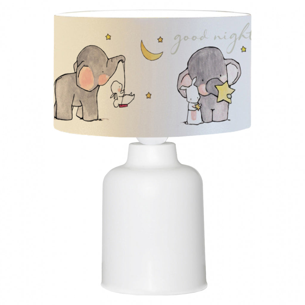 Детска настолна лампа, плат, в бял абажур, с дизайн на слонче. Лампа с отлично качество, с фигури на животни, която ще освежи вашата детска стая. Размери: Φ24x32Y см. Височина на шапката: 14см. Дължина на кабела: 1.5m. Приема крушка E27 до 60W, която не е включена в опаковката. Европейско производство и произход. Продуктът се предлага във фабрична опаковка.