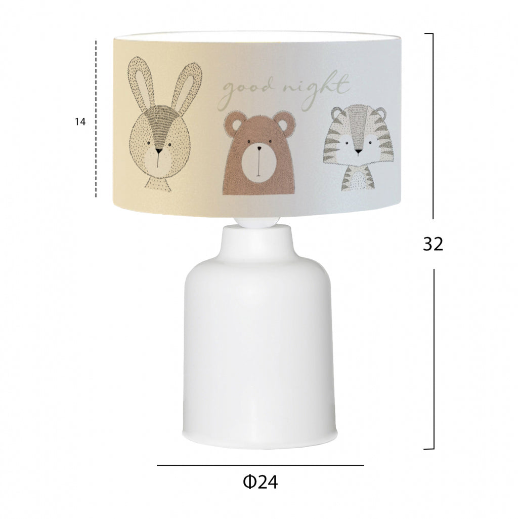 Детска настолна лампа, плат, в бял цвят, с дизайн Cute Animals. Лампа с отлично качество, с детски фигури, която ще обнови вашата детска стая. Размери: Φ24x32Y см. Височина на шапката: 14см. Дължина на кабела: 1.5m. Приема крушка E27 до 60W, която не е включена в опаковката. Европейско производство и произход. Продуктът се предлага във фабрична опаковка.