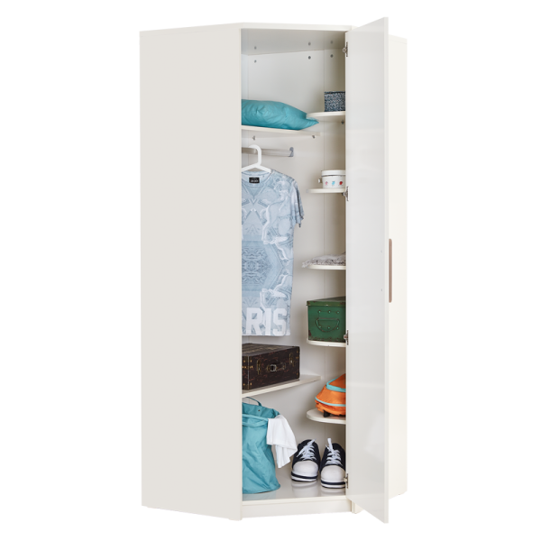 Детски ъглов гардероб JOYIN комбинира практичност и естетика с цели 7 рафта, 1 лост за закачалки и панти с механизъм за плавно затваряне. Изработен е от висококачествено ПДЧ с дебелина 18 мм. Може да се съчетае с двукрилен или трикрилен гардероб, както и с открит модул с рафтове и закачалки – за пълноценна организация на детската стая.
