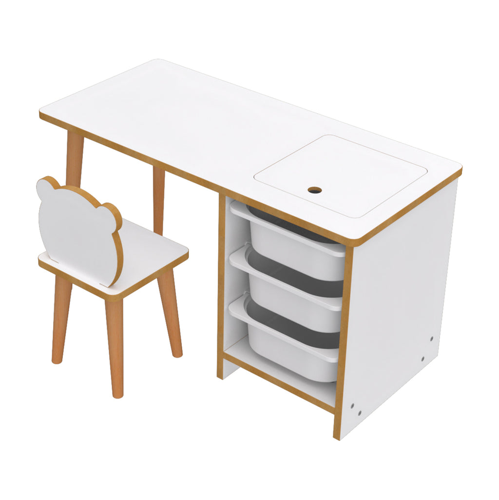 Този детски комплект бюро включва малко бюро и малко столче с фигурна облегалка за нашите малки приятели! Бюрото е с 3 БЕЛИ полиетиленови (пластмасови) чекмеджета от едната страна. Цялата конструкция е изработена от меламин в цвят БЯЛО и НАТУРАЛНО дърво. С този комплект вашето дете ще има функционално пространство за своите занаяти, както и практично решение за съхранение. Ако дори комбинирате това бюро с подходящи мебели за съхранение FRED, BOGG или EZEKIEL, ще имате пълен комплект за съхранение и организиране на детската стая. РАЗМЕРИ: Бюро: 90x42x50H см. Стол: 25x25x48H см.---Височина на седалката: 25см. МАТЕРИАЛИ ЗА ПРОИЗВОДСТВО: Меламинът е вид дървесина под формата на ПДЧ. ПДЧ са продукти, които имат формата на плоча (панел). Това е синтетичен материал с много твърда повърхност, което го прави много устойчив на драскотини, абразия и петна. ПОДДРЪЖКА: Меламинът, който е строителният материал, се почиства много лесно от петна благодарение на твърдата си повърхност. Можете да забършете всички повърхности с влажна кърпа и това е достатъчно, за да изглеждат вашите мебели отново като нови. За упорити петна можете да използвате мек почистващ препарат. КАКВО НИ ХАРЕСВА: •Красив дизайн •Практичност *Продуктът се доставя във фабрична опаковка ** Цветопредаването на продукта може леко да се различава от фотографското изображение на вашия екран.