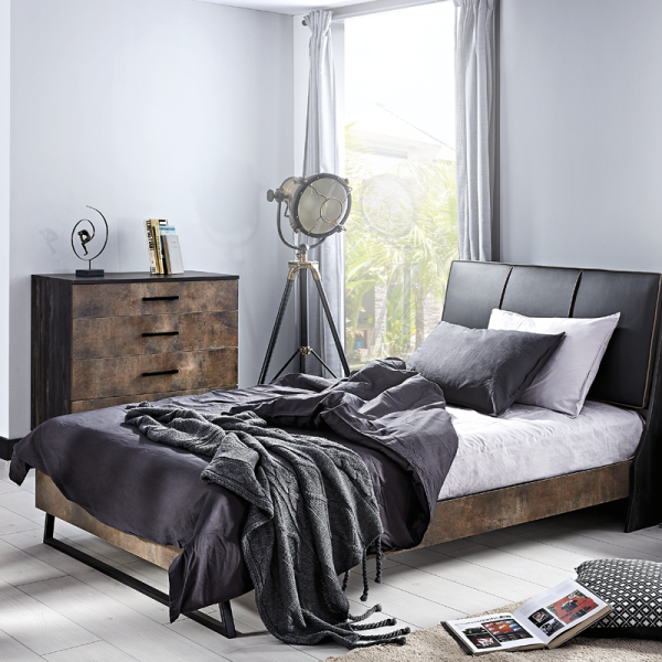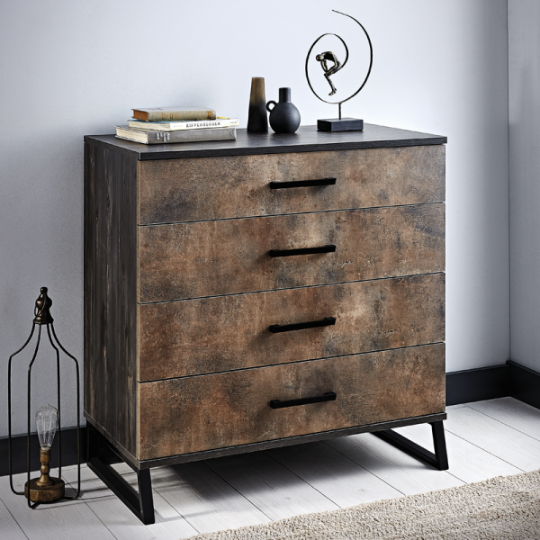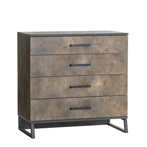 Детският скрин COSMOS е идеално решение за организиране на дрехи и вещи в стаята на подрастващото дете. Със своята индустриална визия и здрава конструкция, той се вписва отлично в стилистиката на цялата серия. Скринът разполага с четири просторни чекмеджета, изработени от плоскости с дебелина 18 и 8 мм, всяко с товароносимост до 25 кг. Чекмеджетата са снабдени с плавна релсова система, която осигурява безшумно и безопасно отваряне и затваряне. Металните дръжки са устойчиви и лесни за използване, а металните крака с височина 13 см гарантират стабилност и улесняват почистването с робот-прахосмукачка.