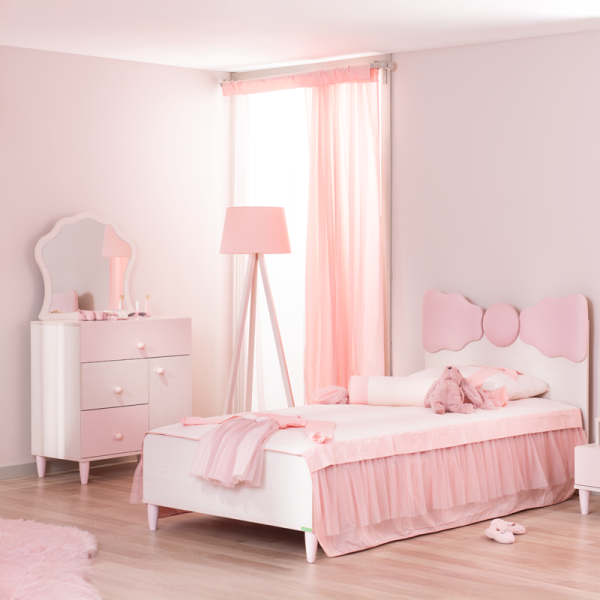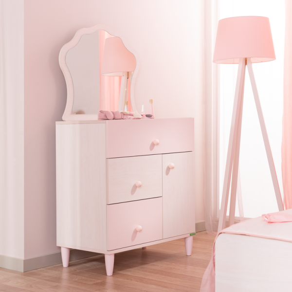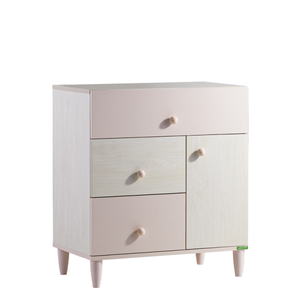 Детски скрин POLLINA съчетава свежи пастелни тонове с практичен дизайн, подходящ за съхранение на дрехи, аксесоари и други необходими вещи в детската стая. Отличава се с меки форми, хармонични цветове и детайли, които го правят едновременно функционален и очарователен. Моделът разполага с три чекмеджета и врата, което осигурява гъвкаво разпределение. Чекмеджетата са изработени от 18 и 8 мм ПДЧ и издържат до 25 кг, като са оборудвани с механизъм с плавно затваряне. Вратата също е със спирачка за безшумно използване.