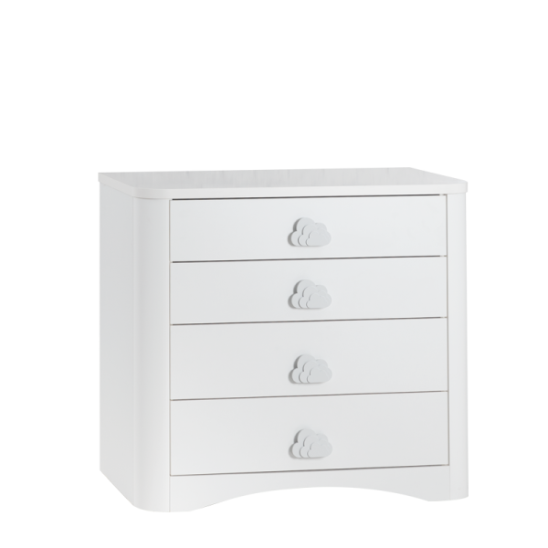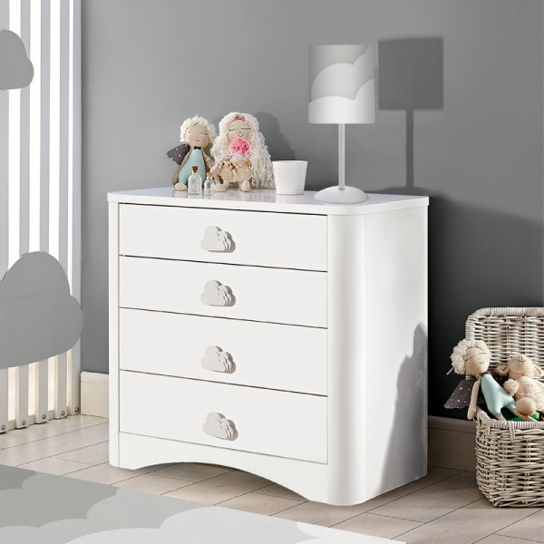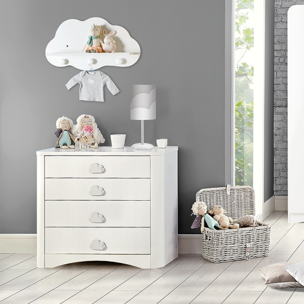 Детски скрин PORI осигурява много място за съхранение на всичко, което е скъпоценно за вашето дете – от играчки и книги до малки дрешки и аксесоари. Чекмеджетата му са проектирани така, че да се отварят и затварят лесно, дори и от малките ръчички, като същевременно гарантират безопасност и тишина благодарение на своята спирачна релсова система. Изработен от първокачествено 18 мм и 8 мм ПДЧ, детски скрин Pori е здрав и надежден. Всяко чекмедже може да издържа до 25 кг, предлагайки достатъчно място за съхранение на всякакви предмети. Дръжките във формата на облаци са не само декоративни, но и изработени от здрав ABS материал, осигурявайки дълготрайност и устойчивост на ежедневна употреба. Със своя дизайн с меки ръбове и елегантна визия, този скрин добавя нотка щастие и уют към стаята на всяко дете. Неговите заоблени форми и нежен бял цвят го правят подходящ за всякакъв интериор и стил на обзавеждане.