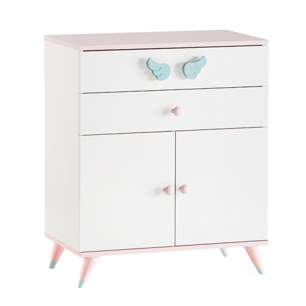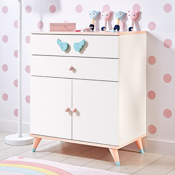 Детски скрин UNICORN – създаден да вдъхновява Детски скрин UNICORN е мебел с отличителен дизайн, която допринася за оригиналния вид на детската стая. Моделът е решен в пастелни цветове – бяло, синьо и розово, и включва закачливи мотиви с ангелски крила и цветни преливки. Цялостната визия е не просто интересна и функционална, тя преобразява стаята на детето в приказно пространство, където то ще твори, вдъхновява и ще се забавлява. Едновременно с това получавате и място за съхранение на всичко необходимо за детския свят – двете чекмеджета и двата шкафа събират всички дрехи, играчки и други ценни вещи на детето ви. Повърхността на скрина, оцветена в розово, предлага достатъчно пространство за подреждане на любими аксесоари за допълнителен чар и функционалност. |