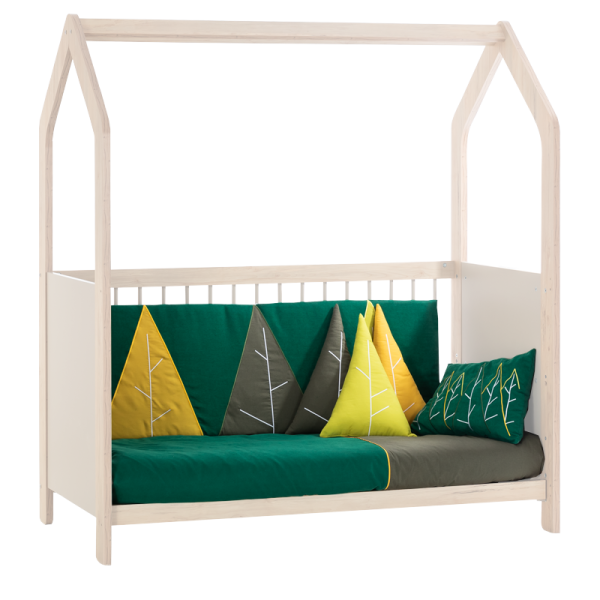 Детски комплект MY HOUSE е създаден, за да осигури максимален уют и приказна атмосфера в детската стая. Той включва мек страничен предпазител и три декоративни възглавници във формата на елхички, които служат едновременно за украса и като нежна защита за задната част на леглото. Комплектът е допълнен от олекотена завивка, удобна възглавница и долен чаршаф в хармонични цветове, съобразени с интериора на серията. Изработен от висококачествени материали, този комплект превръща леглото в сигурно и вдъхновяващо място за почивка и игри.