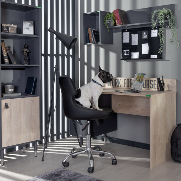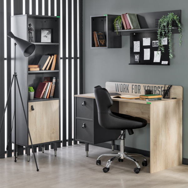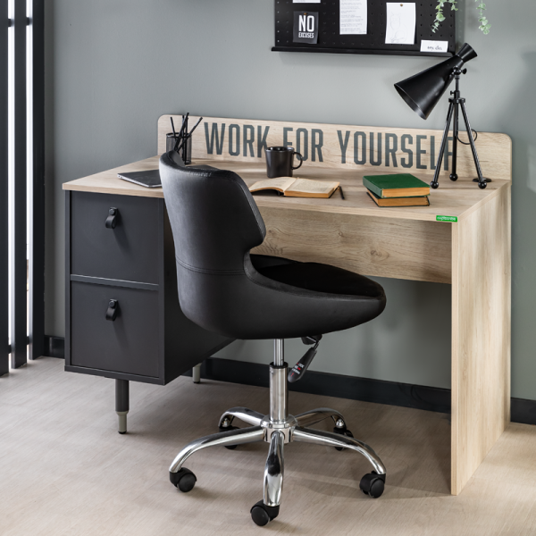 Детско бюро MOTTO съчетава модерен дизайн с практични функции, които вдъхновяват децата и тийнейджърите да учат, творят и да бъдат независими. Силното послание „Work for yourself“, отпечатано върху плота с устойчива UV технология, не избледнява и придава характер на интериора. Бюрото е оборудвано с вграден USB захранващ модул за удобно зареждане на мобилни устройства. Двете чекмеджета с плавно затваряне са изработени от плоскости с дебелина 18 и 8 мм и издържат натоварване до 25 кг всяко. Комбинираните кожени и метални дръжки придават индустриално излъчване и са същевременно стилни и издръжливи. Металните крака с височина 18 см осигуряват стабилност и позволяват лесно почистване с робот-прахосмукачка.