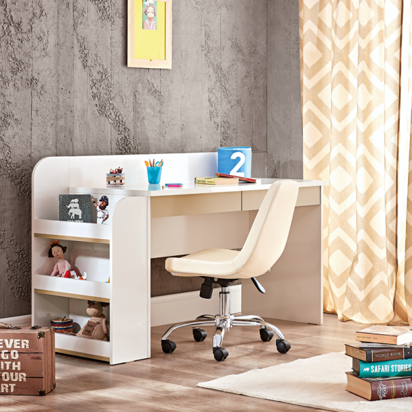 Функционалност, която вдъхновява ученето – детското бюро JOYIN е създадено с внимание към всеки детайл, за да осигури комфортна и организирана работна среда. Широкият плот предлага достатъчно пространство за писане, учене и творчество, а вградената странична етажерка с три отделения е идеалното място за съхранение на книги и учебни пособия. Интегрираната USB станция улеснява зареждането на мобилни устройства по време на работа.