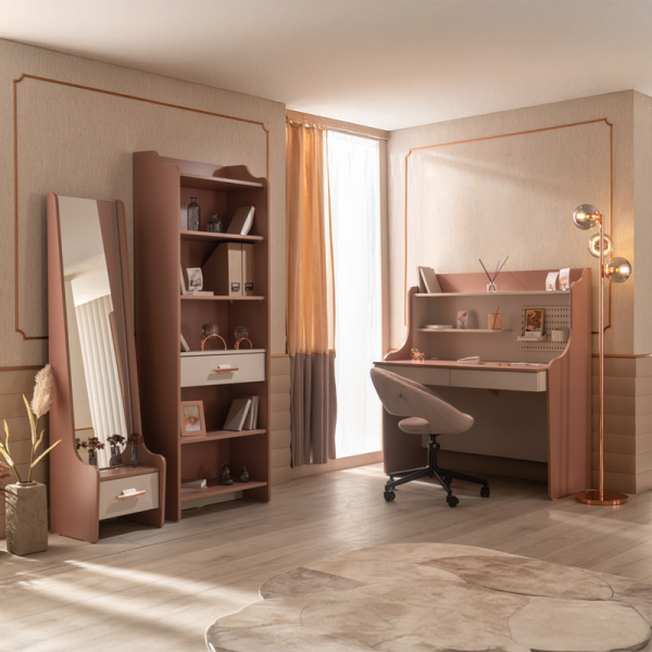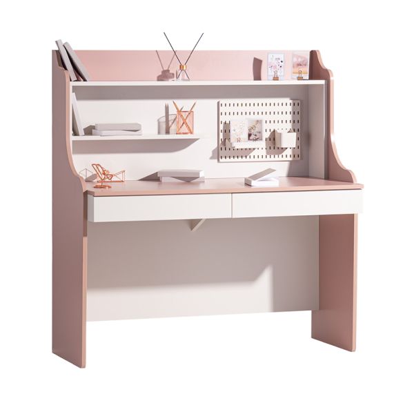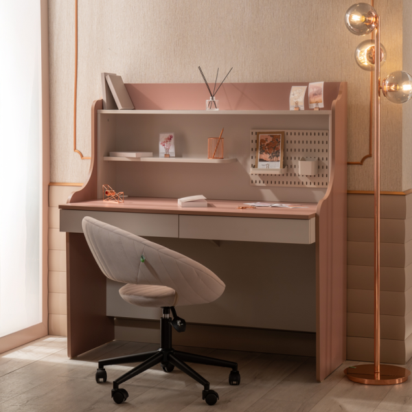 Детското бюро с надстройка ESTELLA предлага интелигентно решение за организиране на учебния процес и творчески занимания. Широкият плот осигурява достатъчно пространство за компютър, книги и учебни материали, а вграденият USB захранващ модул улеснява зареждането на мобилни устройства по време на работа и учение. Надстройката включва практични рафтове за съхранение на книги, тетрадки и декорации, което създава подредена и вдъхновяваща работна среда. В горната част се намира перфорирано метално пано, на което могат да се закачат бележки, снимки и напомняния