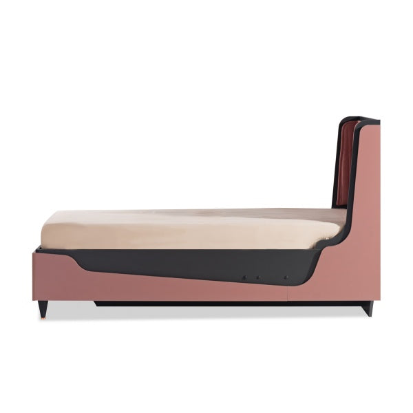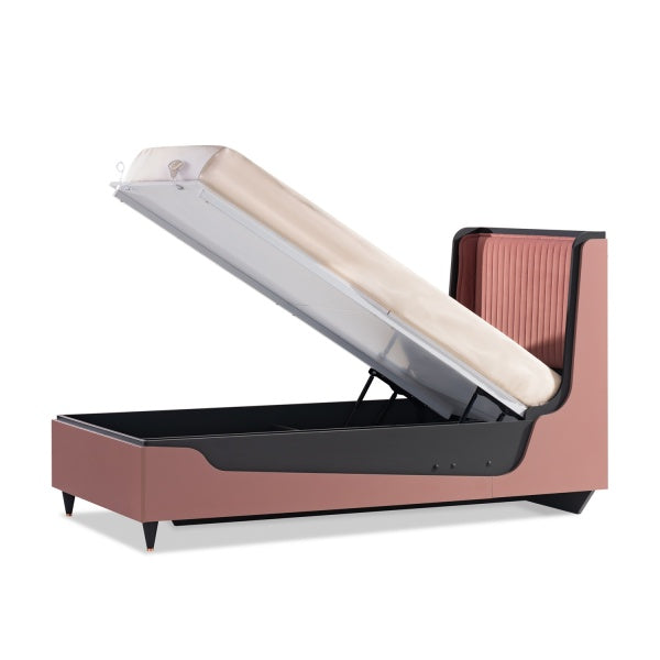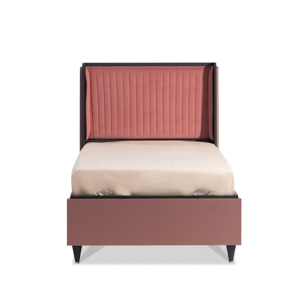 Детското легло VALENCIA 120 х 200 см съчетава луксозен дизайн с висока функционалност, благодарение на вградената база с голямо отделение за съхранение, което оптимизира пространството в стаята. Леглото е оборудвано с амортисьори със защитно заключване, които гарантират безопасно и лесно повдигане и спускане на механизма. Таблата е тапицирана с мек велурен текстил и елегантен капитониран дизайн, а заоблените ъгли и стилните крака с метални акценти придават завършен и изискан вид. Конструкцията от 18 мм ПДЧ с E1 сертификат и капацитет на натоварване до 130 кг осигурява здравина и дълготрайна употреба.