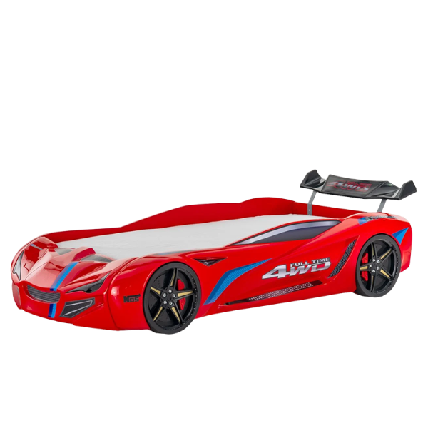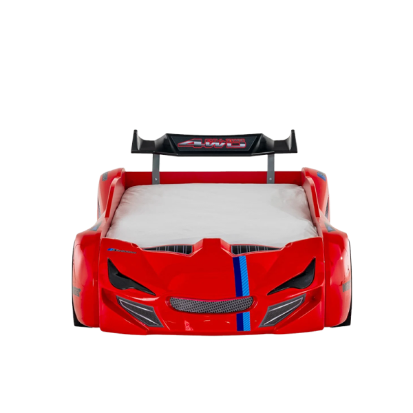 Детско легло TURBO CAP 90 x 190 - червено е сбъдната мечта за малките почитатели на скоростта! Със своя дизайн, вдъхновен от спортните автомобили, моделът внася динамика и настроение във всяка детска стая. Изработено от висококачествено ПДЧ и ABS материали с акрилно покритие, леглото впечатлява с устойчивост, визия и безопасност. Ярките графики са отпечатани с UV технология, устойчива на вода и избледняване, а полипропиленовите декоративни колела придават завършен спортен вид. Леглото разполага с LED светлини и четири звукови ефекта, които се активират с помощта на дистанционно управление – за още по-забавно преживяване. Електронният модул работи с адаптер 12V DC / 2A. Конструкцията е стабилна, с максимално допустимо натоварване до 130 кг, а заоблените ръбове осигуряват допълнителна безопасност. Подматрачната рамка е включена в комплекта.