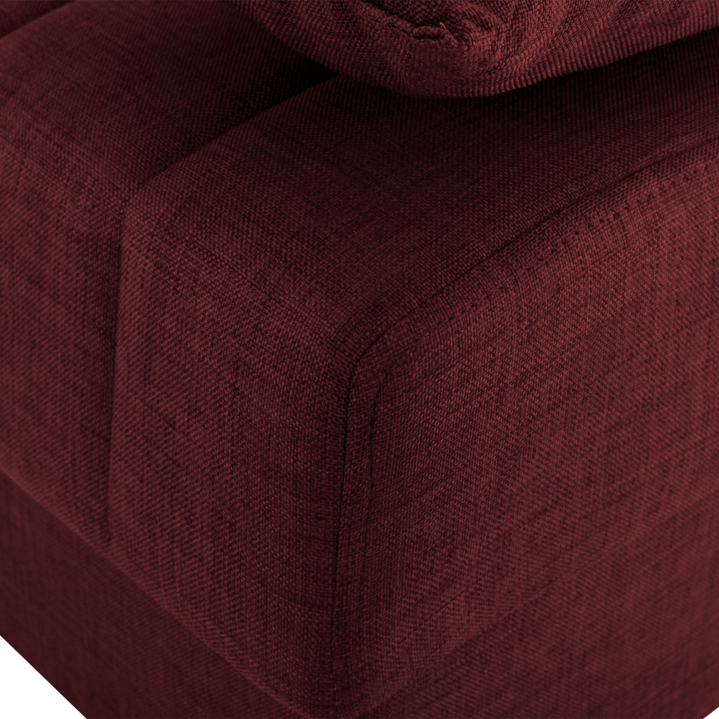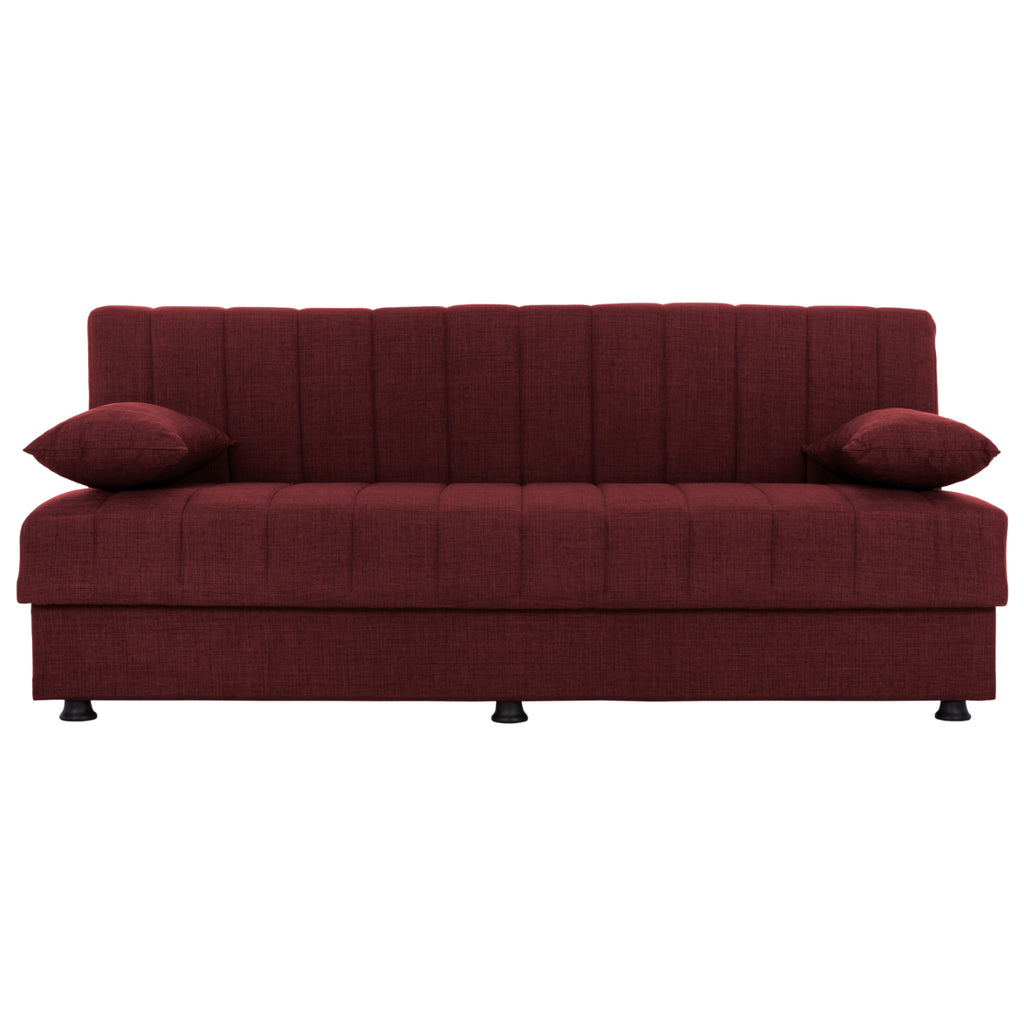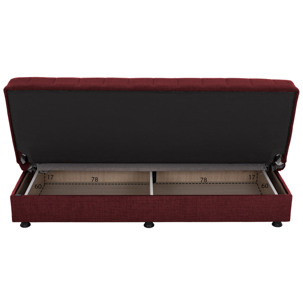 Представяме ви нов, триместен разтегателен диван. Висококачествен и особено практичен диван, който ще зарадва както собственика си, така и гостите му! Започвайки от основите и очевидното, цветът на тапицерията с отличната и добре ушита релефна материя на този диван е червен. Разполага с 2 малки продълговати възглавници със същата материя, които могат да се използват както всеки желае. Характерно за този диван е, че няма подлакътници, в резултат на което не ограничава използването му от потребителите. Той също така се превръща много лесно в легло чрез удобен механизъм (клик-клак), умножавайки полезността му. Под седалката на дивана има 2 места за съхранение с подсилен под, което го прави истински мултифункционален инструмент, особено за студентски къщи, но и за къщи с ограничено пространство като цяло. РАЗМЕРИ: Общи размери: 180x72x77 см. Размери на седалката: 180x56 см. Височина на седалката: 40 см. Размери на облегалката: 180x40 см. Размери на леглото: 180x100 см. Място за съхранение: 78x60x17 см. (x2) Размери на възглавницата: 48x28x17 см. МАТЕРИАЛИ ЗА КОНСТРУКЦИЯ: Рамката на дивана е изработена от дърво. Краката на дивана са ниски, кръгли и изработени от подсилен полиетилен с отлична устойчивост на тегло и влага. Платът, който покрива целия диван, е с отлично качество и е добре пришит към средно твърдата пяна на седалката и облегалката, която е със същата плътност и дебелина, тъй като диванът се превръща и в легло. ПОДДРЪЖКА: Качествените материали за изработка на дивана го правят изключително лесен за употреба! Едно забърсване с влажна кърпа върху цялата му повърхност ще го освежи и ще го запази като нов в продължение на много години. ПРЕДИМСТВА: Този диван е истински мултифункционален инструмент. Той предлага всички характеристики, които го отличават в своята категория. Има двойно приложение като диван и легло, има места за съхранение и няма подлакътници, което увеличава комфорта, който предлага като легло. Но друго много важно предимство са удобните му размери, които го правят подходящ за малки къщи и стаи, а също така го правят лесен за транспортиране.