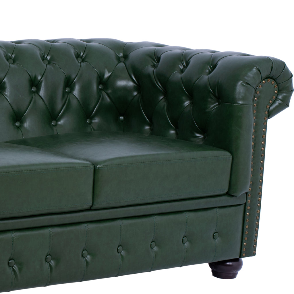 Триместен диван тип Честърфийлд, с абажур от еко кожа 208х90х73см. Елегантен диван тип Честърфийлд с декоративни копчета на рамката ще добави нотка лукс към вашата всекидневна. Този триместен диван ще бъде чудесно място за чат, четене, гледане на телевизия или просто почивка. Отличаващ се със солиден класически дизайн, диванът ще се впише перфектно във всеки интериор на хола. Извитите му рамена предлагат по-голям комфорт и релакс, а декоративните стволове от предната страна го правят специален. Триместният диван е тапициран с висококачествена изкуствена кожа, лесна за почистване и има подсилени дървени крака, които го правят особено стабилен и издръжлив. Размери на седалката: 98х52 см. Размери: 208x90x73 см. Вътрешни размери: 152Х57см. Височина на седалката: 47 см.