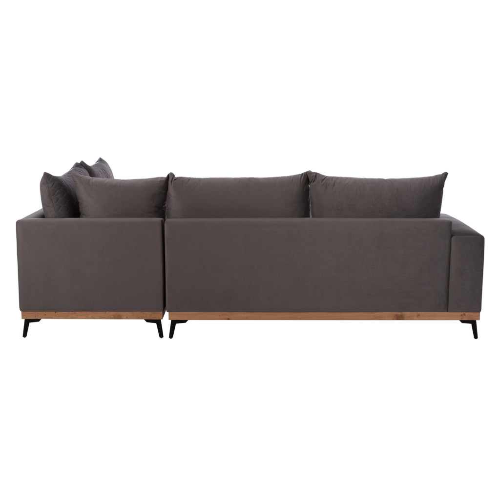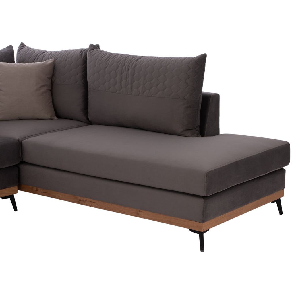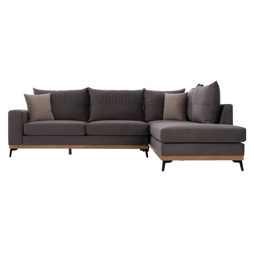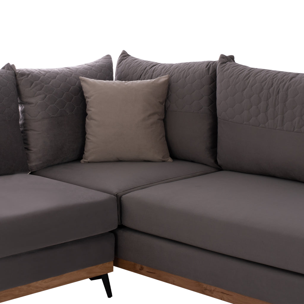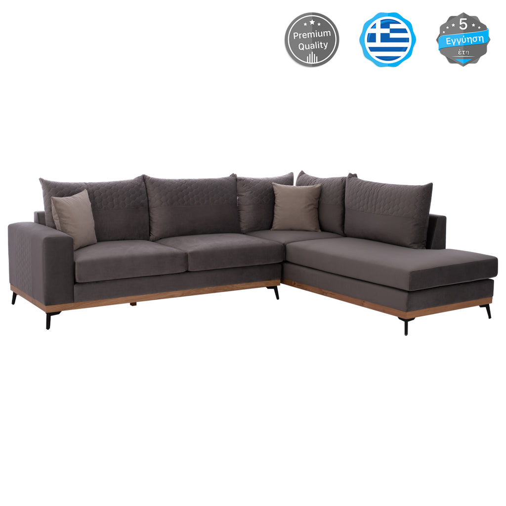 Представяме ви новия, гръцко производство, ъглов диван, с 5 години гаранция. Диван с несравнимо качество и красота, който ще зарадва както своя собственик, така и неговите гости! Започвайки с основите и очевидното, цветът на плюшената тапицерия на този голям диван е SAHARA 13-сив. Разполага с 5 облегални възглавници в същия цвят и две по-малки декоративни възглавнички в цвят САХАРА 16- светло сив. 4-те седални възглавници в комбинация с облегалните възглавници дават идеалното усещане за комфорт! Облегалните възглавници са с полуватиран стил, а на голямата ръкава има и красива капитонирана лента. Възглавниците на гърба са в по-светло сиво, а цветът на двете малки декоративни възглавнички е още по-светъл. Голямата седална възглавница, която оформя ъгъла, няма да затрудни потребителя да напусне седалката си, тъй като има "одра" и залепва за специалната повърхност на рамката. Частта, която създава десния ъгъл, е закопчана и свързана с останалата част от дивана хармонично с подсилени поцинковани панелни закачалки (вертикални чекмеджета) за огромна издръжливост и лекота на използване. Основната привличаща вниманието характеристика на дивана обаче е естествено оцветената дървена рамка, която минава по дължината на дивана в долната част, точно над височината на краката. Наистина красиво докосване, което издига дивана естетически. Краката са високи и помагат за по-добър достъп до пода под дивана, основно за почистване, без да се налага да местите целия диван. РАЗМЕРИ: Общи размери: 290x235x94Y см. (заедно с облегалните възглавници) Размери на седалката: 60см. дълбочина и 97см в ъгъла Височина на гърба: 43см. височина Седална височина: 48см. Височина на ръцете: 64 см. Височина на крака: 12 см. МАТЕРИАЛИ НА ИЗРАБОТКА: Рамката на дивана е изработена от масивна тополова дървесина и MDF облицовка. Когато говорим за масивно дърво, имаме предвид дървета, които са направени изцяло от ствола на дърво и са най-скъпият избор по отношение на дървесина. МДФ (влакна със средна плътност) е модерен материал с основните характеристики на минимално абсорбиране на влага, хомогенност на масата, задоволителни механични свойства, отлична гладкост и много възможности за обработка. Краката на дивана са метални, в резултат на което издръжливостта им на тежест е огромна. Освен това имат пластмасови капачки в долната част, за да предпазят пода от всякакви драскотини и повреди, но и да предпазят краката на дивана от влага. Платът, който покрива целия диван, сега е клас A++ Easy Clean. Това е плат, известен още като alexiasto, който също е 90% водоотблъскващ. Пълнежът на седалните възглавници е пяна със средна твърдост 400plus, докато те имат двойно подсилена вата и допълнителни еластични влакна, за издръжливост и отличен експлоатационен живот. Облегалните възглавници са с пълнеж Rollofill. RolloFill е високотехнологичен пълнежен материал, изработен от еднородни силиконови влакна. Материя, която придава на възглавниците еластичност и бързо възстановяване. Той е напълно хигиеничен, без мирис и хипоалергичен. ПОДДРЪЖКА: Качествените строителни материали на дивана го правят изключително удобен! Както беше обсъдено по-горе, тъканта за подплата е устойчива на петна и до голяма степен водоустойчива, което прави поддръжката лесна. Почистване и минаване с мокра кърпа по цялата й повърхност ще я освежи и ще я запази дълги 