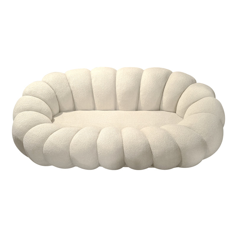 - Тапицирана с висококачествен букле плат, който предлага издръжливост и се предлага в бежов цвят.