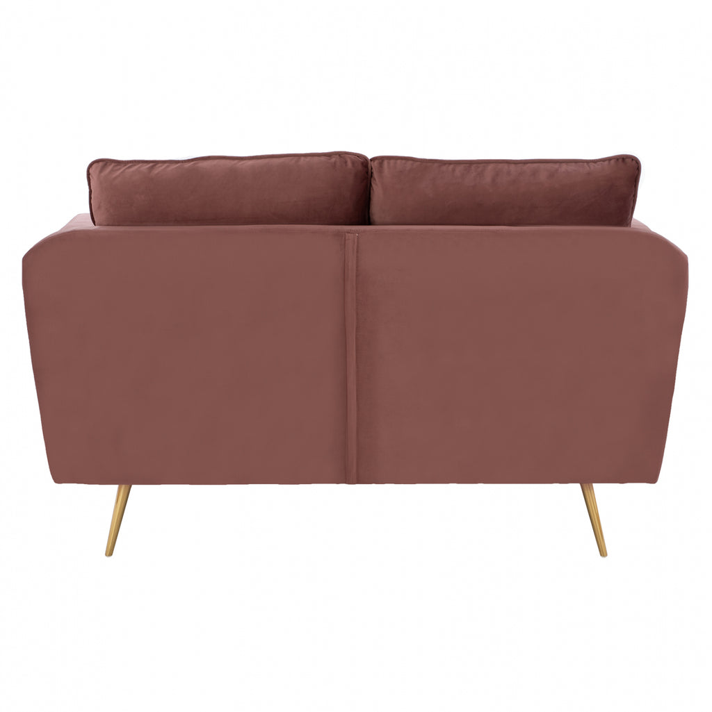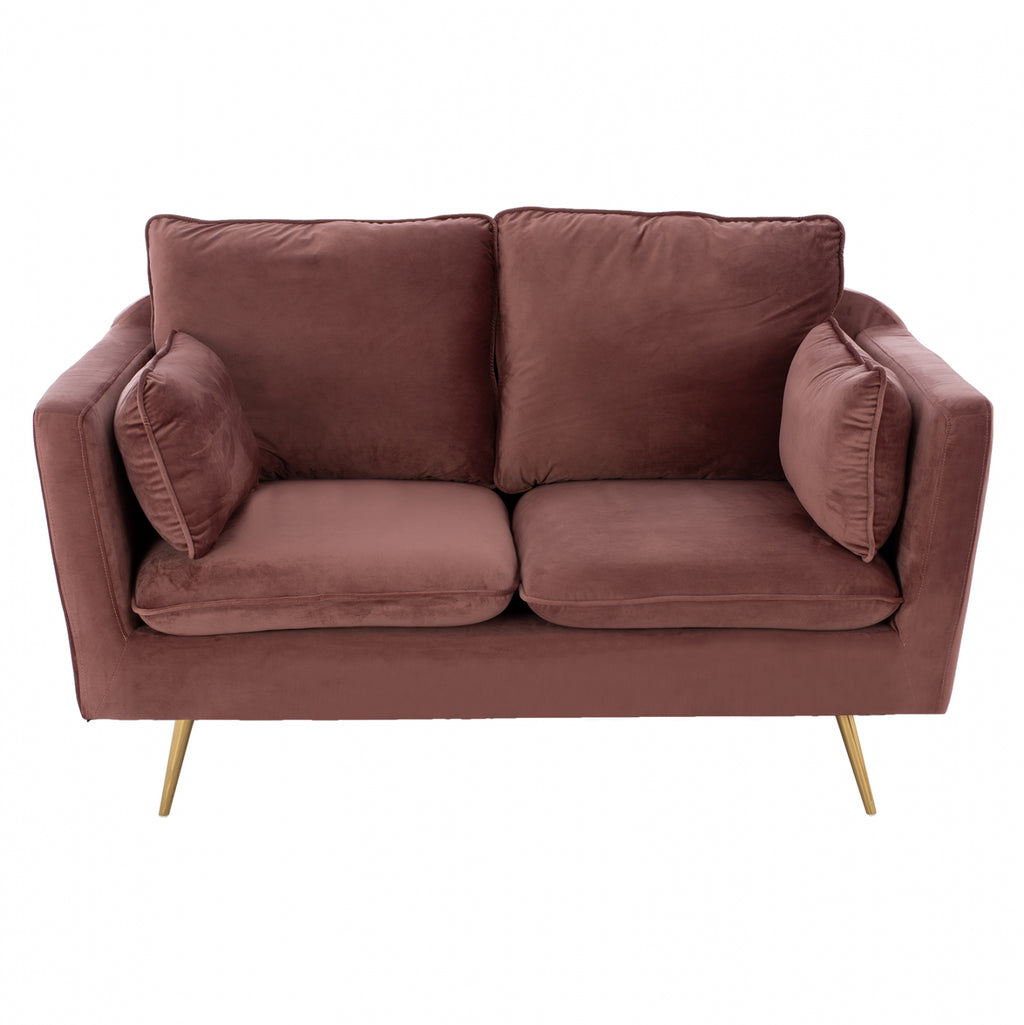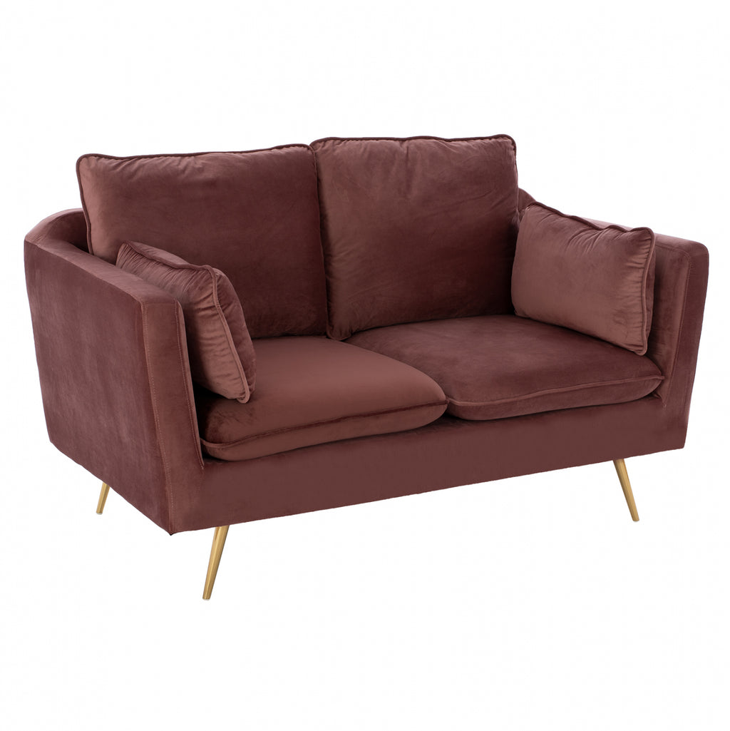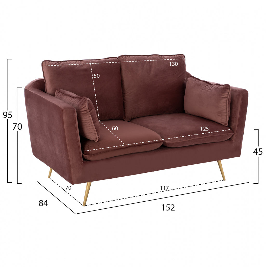 Двуместен диван Карън в нюанс гнила ябълка 152х84х95 см. Този двуместен диван ще бъде чудесно място за чат, четене, гледане на телевизия или просто почивка. Отличаващ се с компактен, но модерен дизайн, диванът ще се впише перфектно във всеки интериор на хола. Двуместният диван е тапициран с кадифе, което не се износва и е с пълнеж от мек дунапрен. Има големи удобни възглавници, на облегалката, седалката и 2 декорации за допълнителен комфорт. Краката са метални позлатени, което прави дивана много стабилен и издръжлив. Размери: 152x84x95 см. Размери на седалката: 125х60 см. Размери на гърба: 130х50см. Височина на крака: 20 см. Височина на седалката: 45 см. Височина на ръцете: 70 см. Разстояние между краката: 117х70 см.