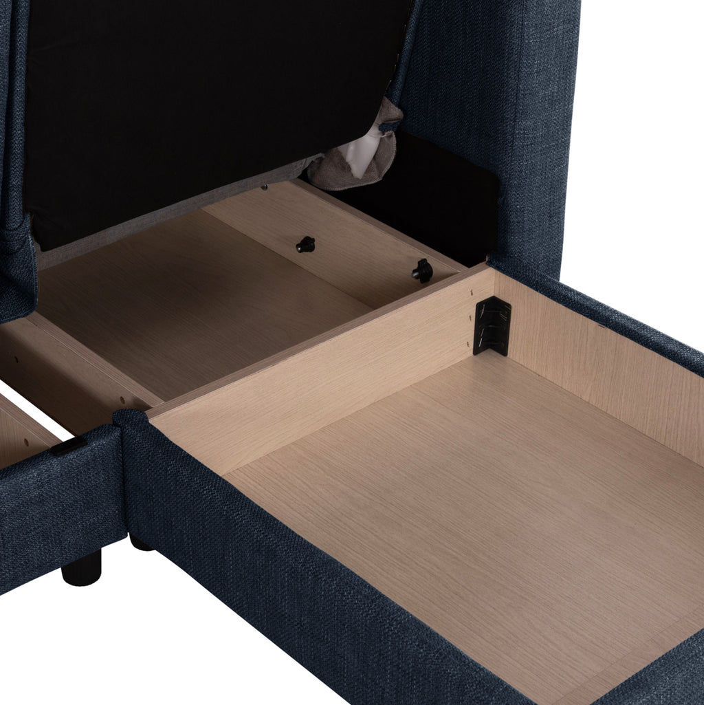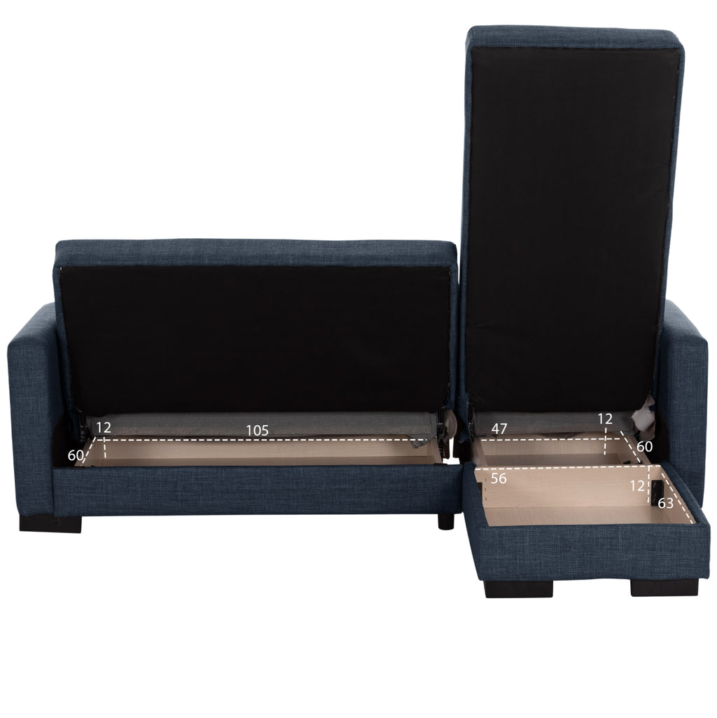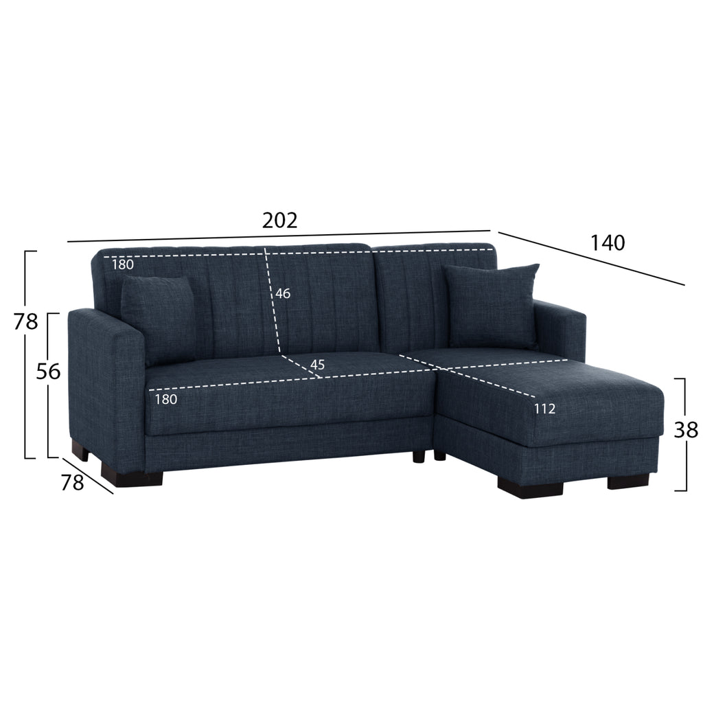 GHUFRAN е удобен и практичен ъглов диван. Цветът на тапицерията на целия диван е СИН, както и двете декоративни възглавници. Висококачествената материя на тапицерията има вертикални шевове само на гърба, докато пълнежът на седалката и облегалката е изработен от пяна, която предлага комфорт и правилна опора, ако се използва като легло. Защото това е основната характеристика на този диван. Освен че е ъглов диван, той се превръща и в легло чрез лесен за използване механизъм "клик-клак". И тъй като диванът може да се постави както в ляв, така и в десен ъгъл, неговата полезност и функционалност надхвърлят обичайното. И сякаш това не е достатъчно, под седалките има места за съхранение, които винаги са полезни във всеки дом, независимо къде е поставен диванът. Друга страхотна характеристика на дивана е, че страната, която образува ъгъла, може да се "отреже" и да се използва като отделен фотьойл или кресло! И накрая, краката на дивана са широки и ниски, което придава твърдост на цялата конструкция. РАЗМЕРИ: 202x78-140x78 см. Размери на седалката: 180x45-112 см. Размери на облегалката: 180x46 см. Височина на седалката: 38 см. Височина на подлакътниците: 56 см. Размери на леглото: 120x100 см. (основната част) 60x165 см. (ъгълът) Място за съхранение: 105x60x12 см. (в основната част) 56x63x12 см. (в ъгъла) 47x60x12 см. (в ъгъла) Височина на краката: 7 см. МАТЕРИАЛИ ЗА КОНСТРУКЦИЯ: Рамката на дивана е дървена, а механизмът на леглото е метален за голяма издръжливост при продължителна употреба. Тапицерията на леглото е изработена от висококачествен плат, а пълнежите както на седалката, така и на облегалката са изработени от пяна със средна твърдост, която предлага комфорт и качествен сън, когато се превърне в легло. Краката са ниски и изработени от подсилен полиетилен, за отлична устойчивост на тегло и влага. ПОДДРЪЖКА: Висококачествените материали, от които е изработен диванът, го правят лесен за употреба и, разбира се, лесен за поддръжка. Редовно почистване с влажна кърпа ще придадат на дивана вид на нов. ПРЕДИМСТВА: • Отлично качество на материалите • Удобна седалка • Преобразуване в легло с лесен механизъм • Ъглова обръщаемост • Здрави крака • Място за съхранение под седалката • Декоративни възглавници • Удобни размери за транспорт, тъй като е сглобен от 3 части. Основна седалка, ъглова част и подлакътници.