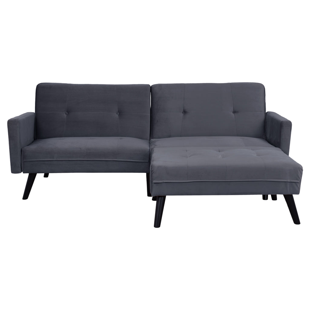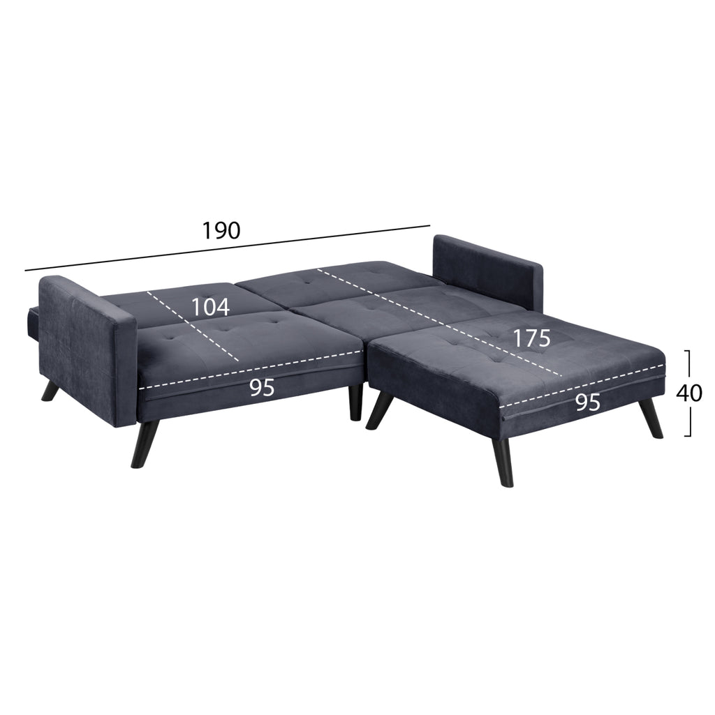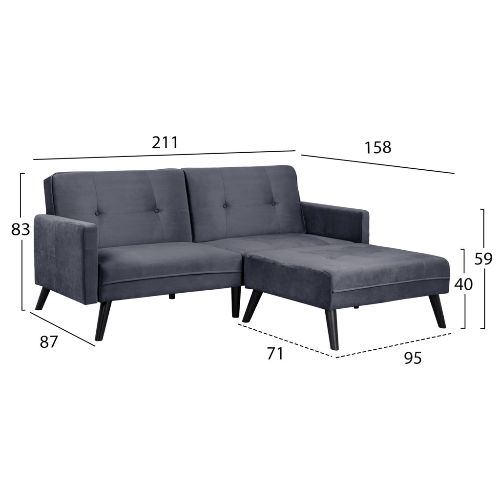 Ъглов разтегателен диван, с табуретка, тапициран с дамаска сиво кадифе 211X158X83Y см. Ъглов сгъваем диван, гъвкав за използване, може да се регулира според изискванията на вашето собствено пространство, е умно и практично предложение за спестяване на място в офиса или у дома. Диван, с голяма и удобна седалка, проектиран да излъчва комфорт и практичност. Подплатени отвън с висококачествен плюшен плат. Има подсилени полипропиленови крака, в черен нюанс и е особено стабилен и издръжлив. Той е идеален избор за тези от вас, които търсят нещо елегантно, функционално и качествено. Размери на ъгъл: 211х87-158х83см. Височина на седалката: 40см. Височина на ръцете: 59см. Размери на седалката: 190x51-122 см. Размери на леглото: 190х104-175см. Размери на 3-местния диван: 211х87х83 см. Размери на табуретка: 95х71х40см.