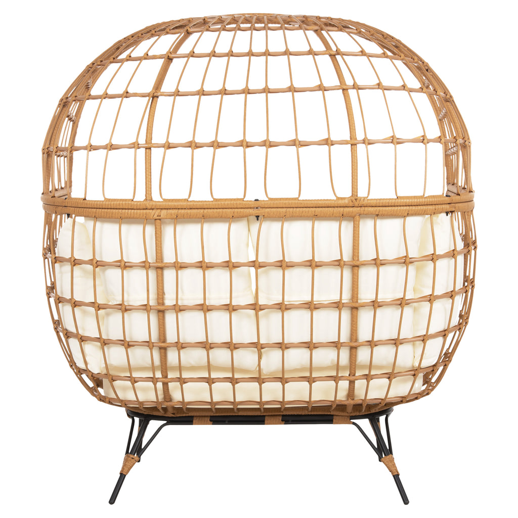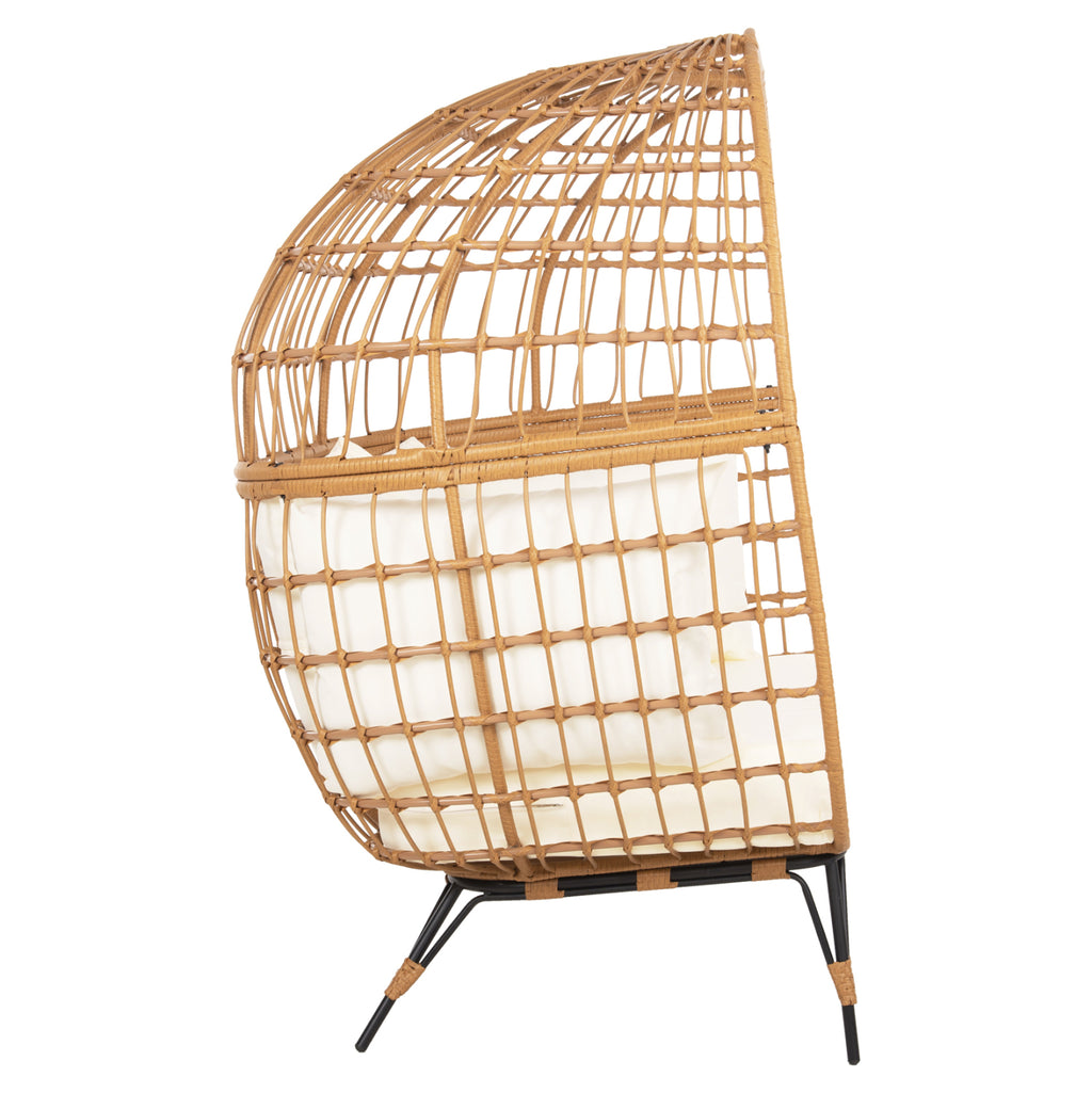 Рамката е изработена от черен метал с висока якост. Основата завършва с четири стабилни крака. Седалката и балдахинът са изработени от синтетичен ратан в бежов цвят. Това придава модерен и топъл акцент на всяко пространство. Размерите 132.5x90x154 см осигуряват достатъчно място за удобно настаняване на двама души.