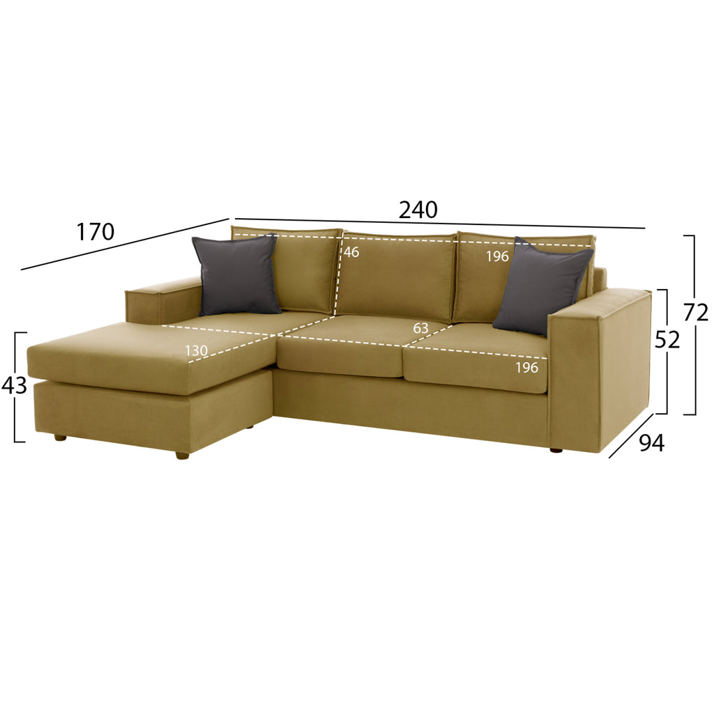 ХОМЕМАРКТ ви представя новия, гръцко производство, ъглов диван "МОНАКО", с 5 години гаранция. Диван с несравнимо качество и красота, който ще зарадва както своя собственик, така и неговите гости! Започвайки с основите и очевидното, цветът на плюшената тапицерия на този диван е ЗЛАТЕН. Разполага с 3 възглавници за гръб и 3 възглавници за седалка, които ще дадат перфектно усещане за комфорт! Приятният естетичен щрих с релията в същия цвят, която минава през ъглите на подлакътниците, както и облегалните възглавници и декоративните възглавници допълват естетическото превъзходство на дивана по най-добрия начин. Всъщност двете декоративни възглавници са в СИВ цвят, създавайки красив двуцветен цвят. Основната характеристика на дивана обаче е, че създава ъгъла, който ви харесва, независимо дали е ляв или десен. Частта, която оформя ъгъла, е самостоятелна и е свързана с останалата част от дивана хармонично с дамаска с "черта", която се намира под голямата възглавница в ъгъла. РАЗМЕРИ: Общи размери: Общи размери: 240x94 - 170x72 - 86см. Размери на седалката: 192x63 - 130 см. Размери на гърба: 196х46см. Височина на седалката: 43 см. Височина на ръцете: 52 см. МАТЕРИАЛИ НА ИЗРАБОТКА: Рамката на дивана е изработена от масивна тополова дървесина и MDF облицовка. Когато говорим за масивно дърво, имаме предвид дървета, които са направени изцяло от ствола на дърво и са най-скъпият избор по отношение на дървесина. Тополата принадлежи към твърдите дървесини, но в зависимост от вида може да бъде по-мека от някои други дървесини, които принадлежат към меката категория. Обикновено се използва широко за направата на няколко вида мебели. МДФ (влакна със средна плътност) е модерен материал с основните характеристики на минимално абсорбиране на влага, хомогенност на масата, задоволителни механични свойства, отлична гладкост и много възможности за обработка. Краката на дивана са ниски, кръгли и изработени от подсилен полиетилен с отлична устойчивост на тежест и влага. Платът, който покрива целия диван, сега е клас A++ Easy Clean. Това е плат, известен още като alexiasto, който също е 90% водоотблъскващ. Пълнежът на седалните възглавници е пяна със средна твърдост 400plus, докато те имат двойно подсилена вата и допълнителни еластични влакна, за издръжливост и отличен експлоатационен живот. Облегалните възглавници са с пълнеж Rollofill. Rollo Fill е високотехнологичен пломбиращ материал, изработен от еднородни силиконови влакна. Материя, която придава на възглавниците еластичност и бързо възстановяване. Той е напълно хигиеничен, без мирис и хипоалергичен. ПОДДРЪЖКА: Качествените строителни материали на дивана го правят изключително удобен! Както беше обсъдено по-горе, тъканта за подплата е устойчива на петна и до голяма степен водоустойчива, което прави поддръжката лесна. Почистване и минаване с мокра кърпа по цялата й повърхност ще я освежи и ще я запази дълги години като нова. ПРЕДИМСТВА: •Произведено в Гърция •Масивна дървена рамка •Високотехнологични и качествени строителни материали •Материя клас A++ Easy Clean, устойчива на петна и 90% водоустойчива •Цип на възглавниците и декорациите на седалката и облегалката •Възможност за смяна на ляв или десен ъгъл •Удобен размер •Самозалепващ се "грач", който държи ъгъла на място •Произвежда се от 2 части, което се комбинира със средния си размер прави го идеален 