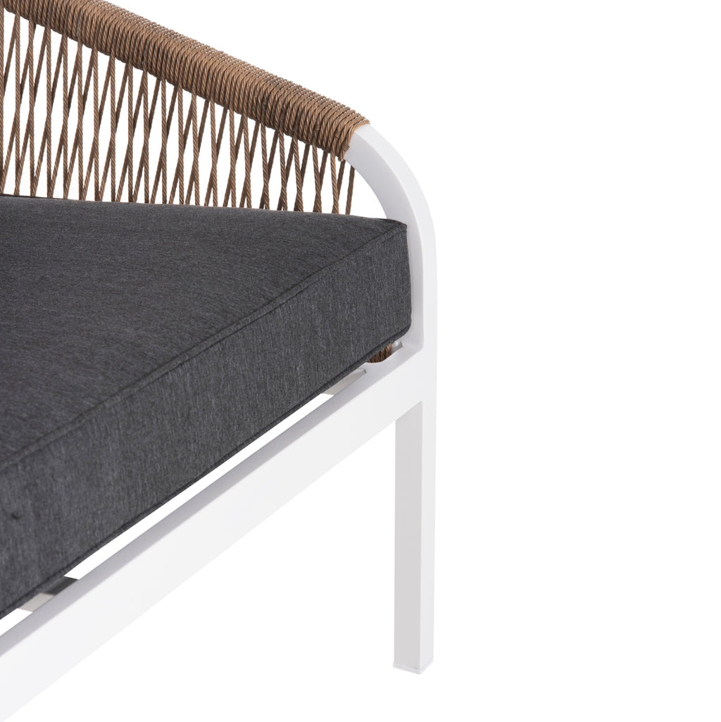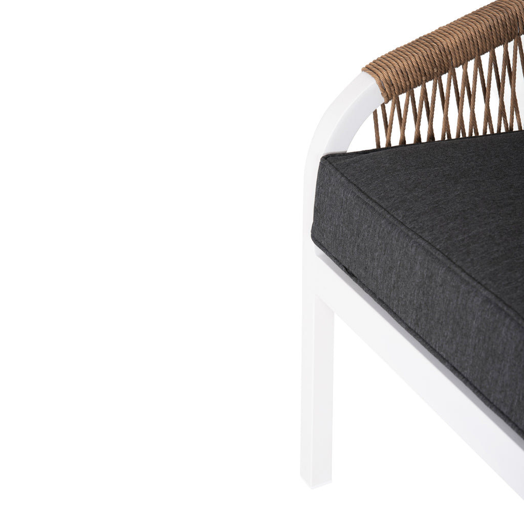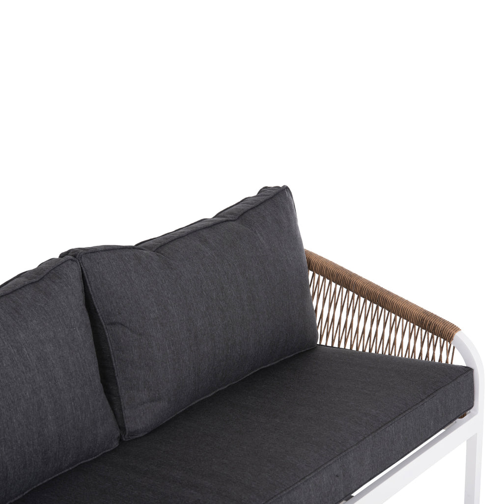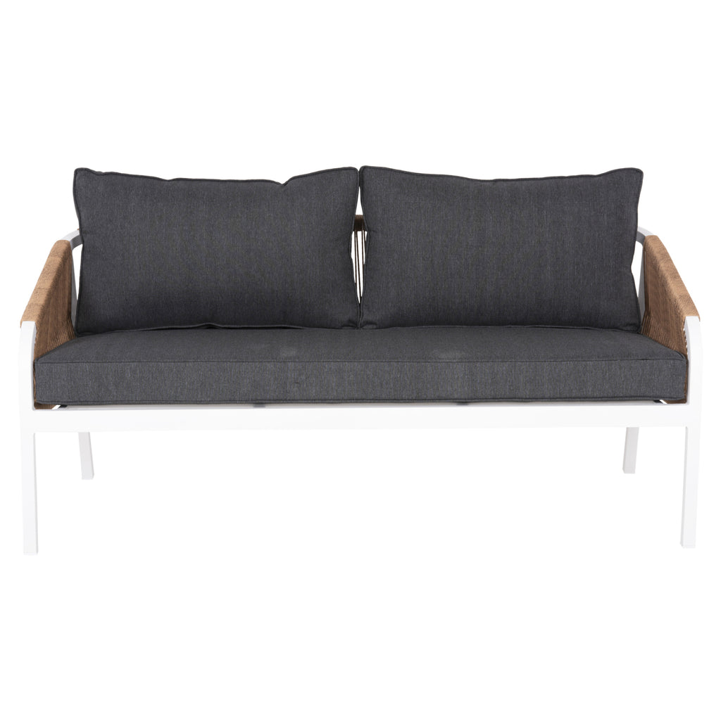 Представяме ви MAERLY, красив 3-местен външен диван в комбинация БЯЛО-ВЪГЛЕН. Комбинацията от алуминиева рамка в БЯЛ цвят с ТЪМНО БЕЖОВО синтетично въже, преплетено по целия диван, както и 2-те големи облегални възглавници с полиестерна дамаска в цвят КАРБОН е уникална и може веднага да промени образа на всяко открито пространство. Характерна особеност на този диван е, че краката са високи, което води до висока височина на седалката. РАЗМЕРИ: 156x72x72Y см. Височина на седалката: 46 см. Височина на ръцете: 55-68 см. Размери на седалката: 150х46 см. Размери на гърба: 150х30-39см. Разстояние между краката: 150-156x63.5-70см. Височина на крака: 29 см. Дебелина на седалната възглавница: 6см. Спецификации на алуминия: Φ25xT1.5mm Спецификации на синтетичното въже: Φ21mm КОНСТРУКТИВНИ МАТЕРИАЛИ: Рамката на дивана е изработена от алуминий, боядисан с електростатична боя. Алуминият е метал с отлични механични свойства и много устойчив на различни форми на корозия по природа и изисква минимални разходи за поддръжка. Може да се рециклира неограничено време, запазвайки характеристиките си без влошаване на качеството. Информация: Електростатичното боядисване е процес на сухо покритие, използван като метално покритие. Електростатичното боядисване е нанасяне на сух прах чрез електростатичен процес, който след това се „свързва“ към метала чрез топлина. ПОДДРЪЖКА: Идеалното за поддръжка на алуминий е използването на много мека кърпа или гъба, обилно количество вода и мек почистващ продукт, като например препарат за миене на съдове. Алуминиевите мебели нямат специални изисквания за поддръжка, тъй като не корозират. **Точното цветопредаване на продукта може леко да се различава от действителния продукт поради различни настройки на монитора.
