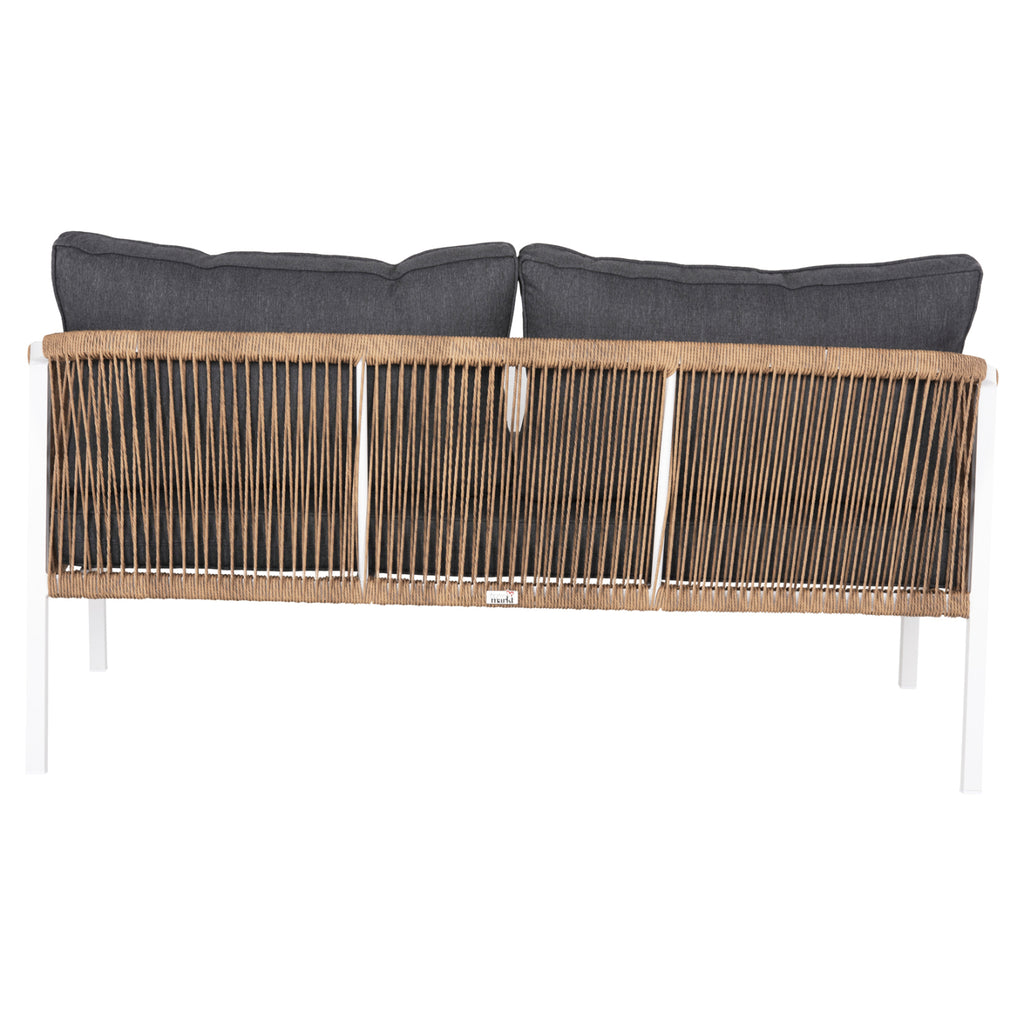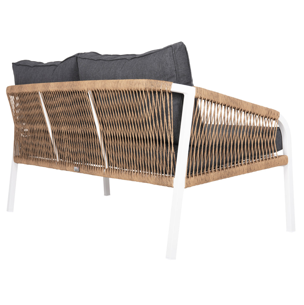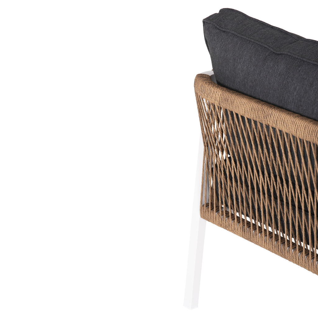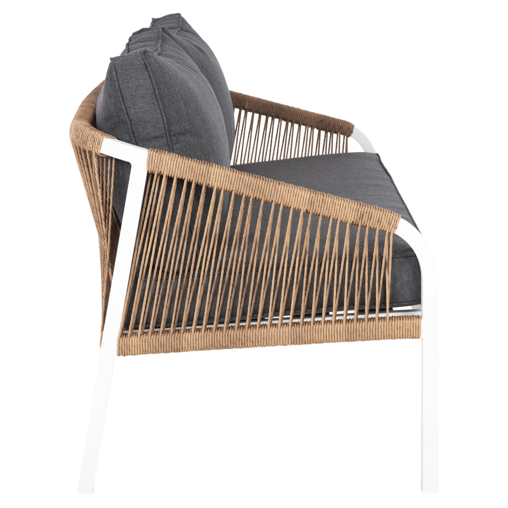 Представяме ви MAERLY, красив 3-местен външен диван в комбинация БЯЛО-ВЪГЛЕН. Комбинацията от алуминиева рамка в БЯЛ цвят с ТЪМНО БЕЖОВО синтетично въже, преплетено по целия диван, както и 2-те големи облегални възглавници с полиестерна дамаска в цвят КАРБОН е уникална и може веднага да промени образа на всяко открито пространство. Характерна особеност на този диван е, че краката са високи, което води до висока височина на седалката. РАЗМЕРИ: 156x72x72Y см. Височина на седалката: 46 см. Височина на ръцете: 55-68 см. Размери на седалката: 150х46 см. Размери на гърба: 150х30-39см. Разстояние между краката: 150-156x63.5-70см. Височина на крака: 29 см. Дебелина на седалната възглавница: 6см. Спецификации на алуминия: Φ25xT1.5mm Спецификации на синтетичното въже: Φ21mm КОНСТРУКТИВНИ МАТЕРИАЛИ: Рамката на дивана е изработена от алуминий, боядисан с електростатична боя. Алуминият е метал с отлични механични свойства и много устойчив на различни форми на корозия по природа и изисква минимални разходи за поддръжка. Може да се рециклира неограничено време, запазвайки характеристиките си без влошаване на качеството. Информация: Електростатичното боядисване е процес на сухо покритие, използван като метално покритие. Електростатичното боядисване е нанасяне на сух прах чрез електростатичен процес, който след това се „свързва“ към метала чрез топлина. ПОДДРЪЖКА: Идеалното за поддръжка на алуминий е използването на много мека кърпа или гъба, обилно количество вода и мек почистващ продукт, като например препарат за миене на съдове. Алуминиевите мебели нямат специални изисквания за поддръжка, тъй като не корозират. **Точното цветопредаване на продукта може леко да се различава от действителния продукт поради различни настройки на монитора.