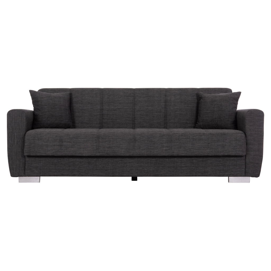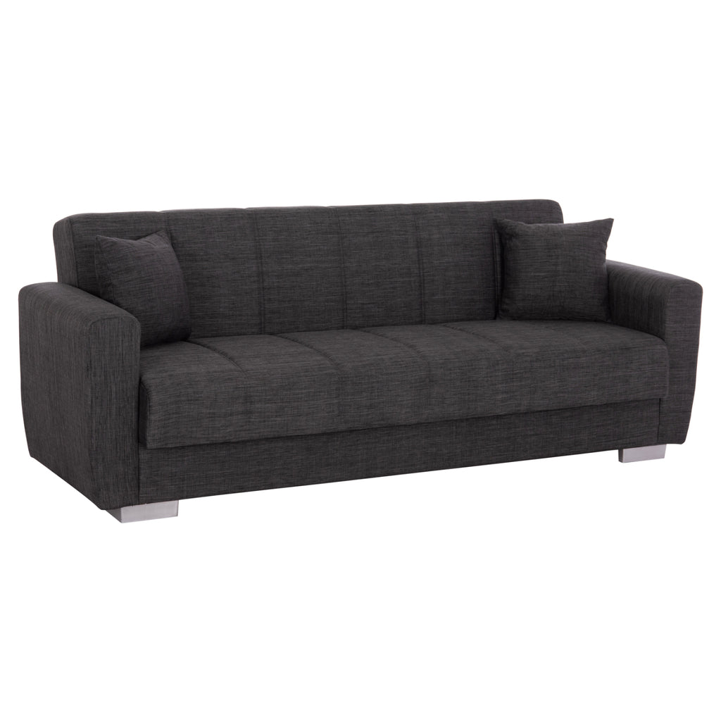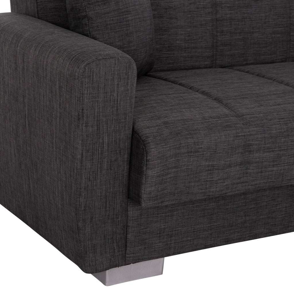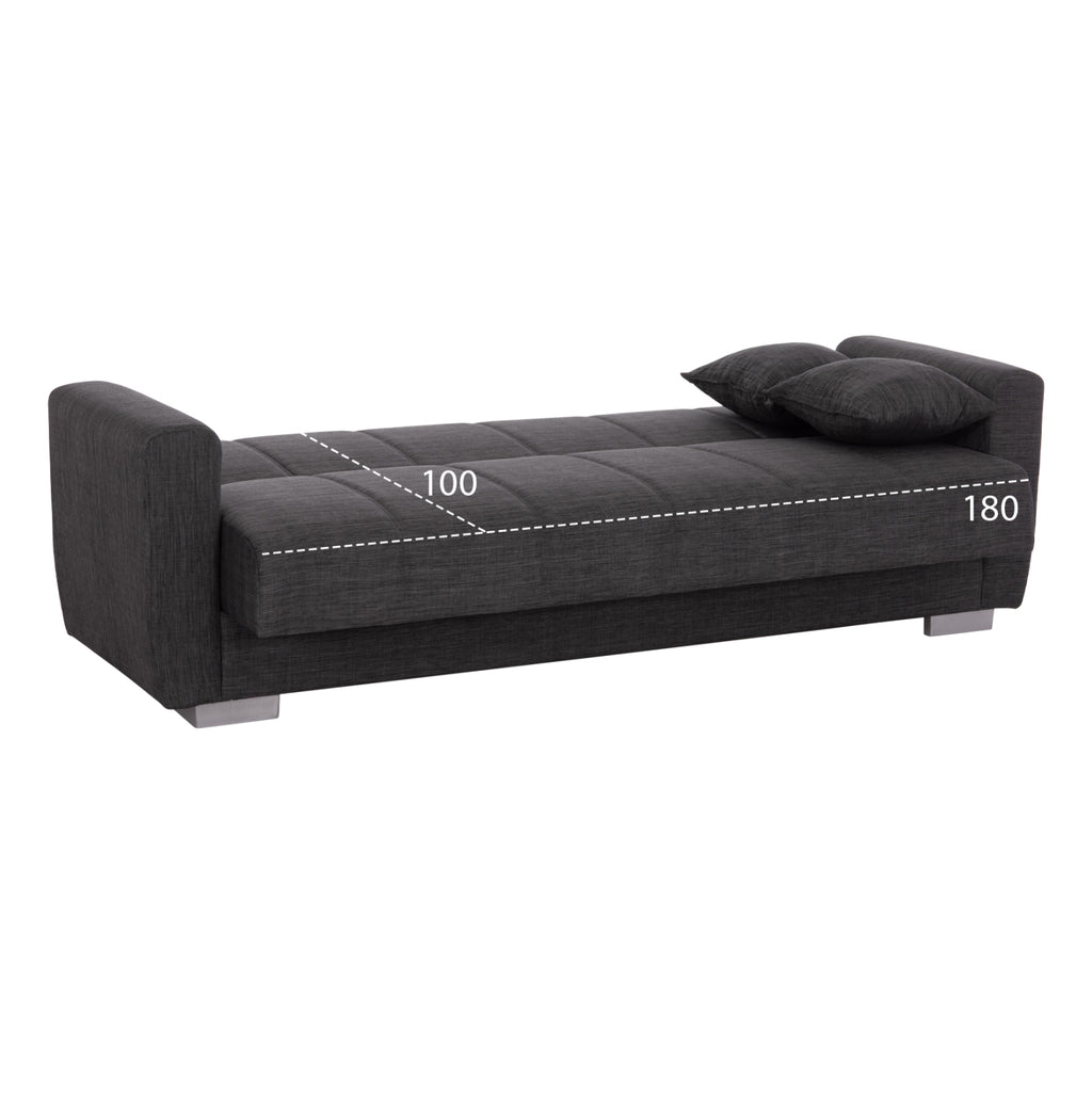 КГ3240.03 е 3-местен диван, красив и практичен. Тапицерията му е изработена от висококачествен СИВ плат, както и двете декоративни възглавници. Естетически, облегалката и седалката на дивана имат вертикални шевове, които го разкрасяват, а подлакътниците са достатъчно широки, за да предложат комфорт и опора. Основната характеристика на дивана обаче е, че облегалката се сгъва и се превръща в удобно легло за спешни случаи, чрез лесен за използване механизъм "щрак-щрак". Следствие от това, разбира се, е наличието на място за съхранение под седалката на дивана, което винаги е полезно, особено в студентските жилища. И накрая, краката на дивана са широки и ниски, което придава здравина на цялата конструкция. РАЗМЕРИ: 215x85x76H см. Размери на седалката: 180x55 см. Размери на облегалката: 180x41 см. Височина на подлакътниците: 57 см. Височина на седалката: 40 см. Размери на леглото: 180x100 см. Място за съхранение: 84,5x60x16H см.(x2) МАТЕРИАЛИ ЗА ИЗРАБОТКА: Рамката на дивана е дървена, докато механизмът на леглото е метален за голяма издръжливост при продължителна употреба. Тапицерията на леглото е изработена от висококачествен плат, а пълнежът както на седалката, така и на облегалката е от средно твърд дунапрен, който предлага комфорт и качествен сън, когато се превърне в легло. Краката са ниски и са изработени от подсилен полиетилен с "метален" вид, за отлична устойчивост на тегло и влага. ПОДДРЪЖКА: Висококачествените материали за изработка на дивана го правят лесен за употреба и, разбира се, лесен за поддръжка. Редовно почистване с влажна кърпа ще придадат на дивана вид на нов. ПРЕДИМСТВА: •Отлично качество на материалите за изработка •Удобна седалка •Преобразуване в легло с механизъм •Здрави крака •Място за съхранение под седалката •Удобни подлакътници •Декоративни възглавници •Удобни размери за 3 души **Точното цветопредаване на продукта може леко да се различава от действителното поради различните настройки на всеки монитор.