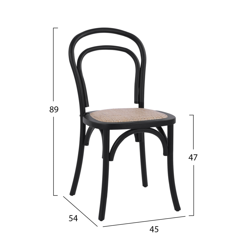 Никога не подценявайте стойността на вечния дом или ресторант. Освежете вашата трапезария или офис всекидневна с винтидж атмосфера, която ще завижда на всички и създайте уникален ефект, който да покажете. Стол ALIYAH е изработен от високоздрава букова дървесина в черен матов нюанс със седалка мат. Освен това е фабрично сглобен, стифиращ се и е подходящ за оборудване на бизнес помещения. Комбинирайте го с дървена маса със същата естетика и получете трапезарията, която винаги сте искали. Размери: 45х54х89 см. Височина на седалката: 47 см. Размери на седалката: 45х42 см. ФАБРИЧНО МОНТАЖЕН