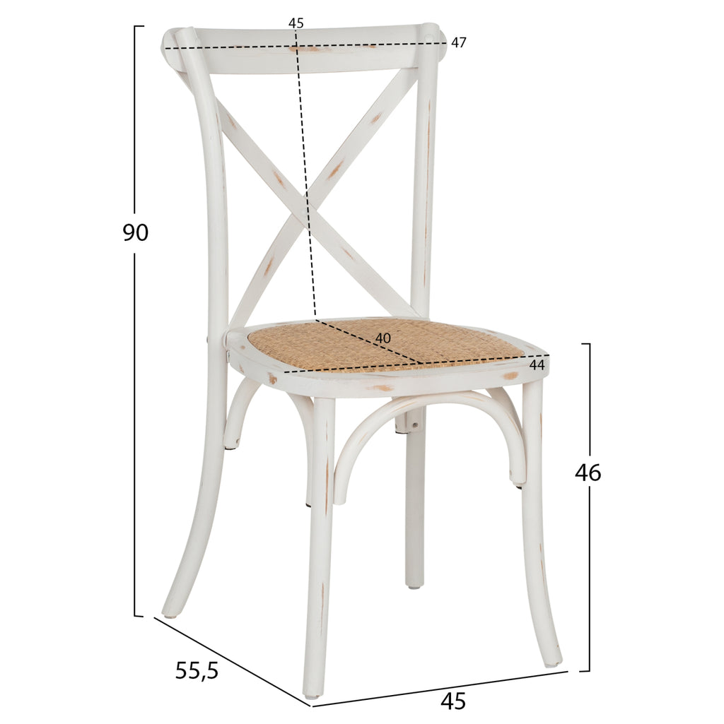 Столът е изработен от високоздрава букова дървесина в бял цвят, а седалката на стола е от ръчно тъкана рогозка.