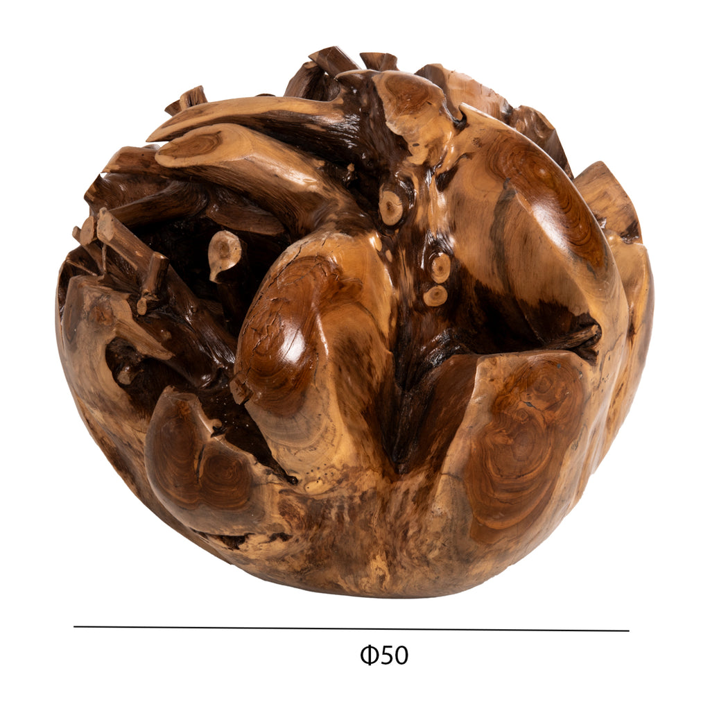 Подовата декорация CLEM ще придаде друг "облик" на вашето пространство. Неговият почти сферичен дизайн е уникален и интересен, като същевременно може да се съчетае с много декоративни шарки. Полираното парче дърво, от което се състои декорацията, е в естествения си цвят, а размерите на цялата конструкция правят това парче внушително, където и да се постави. РАЗМЕРИ: Φ50см. *Поради спецификата на масивната дървесина изображението и размерите могат да варират при всеки продукт. МАТЕРИАЛИ НА ИЗРАБОТКА: Декорацията е от масивно тиково дърво. Когато говорим за масивно дърво, имаме предвид дървета, направени изцяло от ствола на дърво. Масивната дървесина е най-скъпият избор по отношение на дървесината, но се откроява със своята вечна естетика. Тикът е най-популярният вид твърда дървесина. Той е жълт до тъмно кафяв на цвят, изключително тежък, с висока якост, устойчив на атмосферни влияния, устойчив на стружки и не се разлага. Често водите на дървото му са силни и прави. Използва се за много вътрешни и външни конструкции. ПОДДРЪЖКА: Фактът, че ТИК е част от твърдата дървесина, го прави много лесен за поддръжка. Всичко, от което се нуждае, е почистване от прах и при необходимост почистване с влажна кърпа. ПРЕДИМСТВА: Тази декорация може да се побере навсякъде, където пожелаете. Или у дома, или в бизнес помещения.
