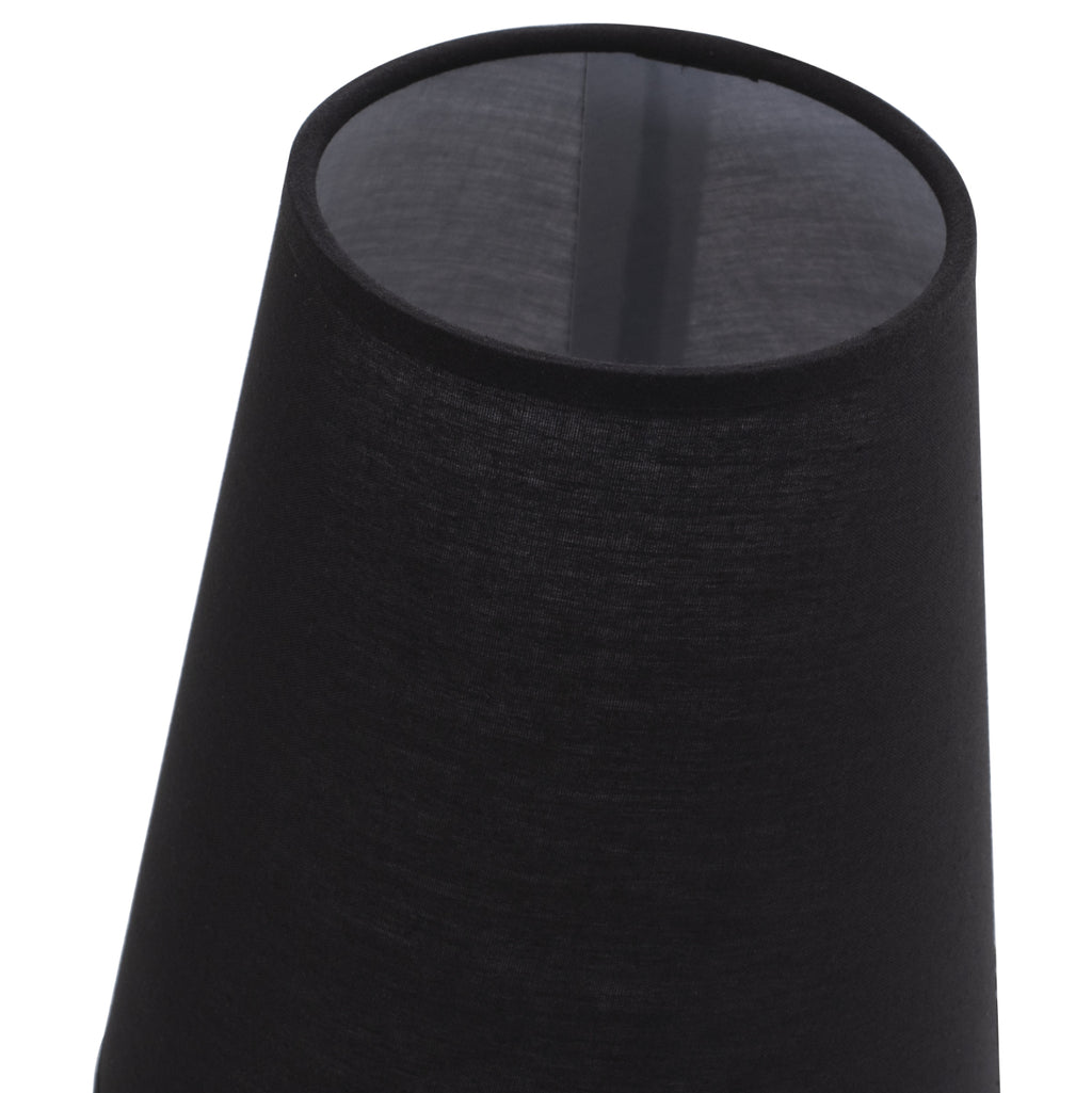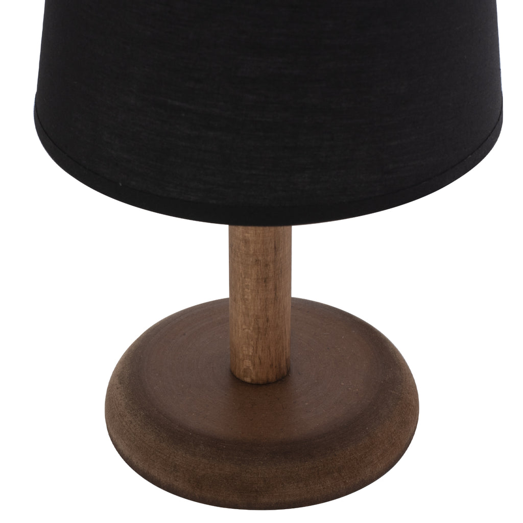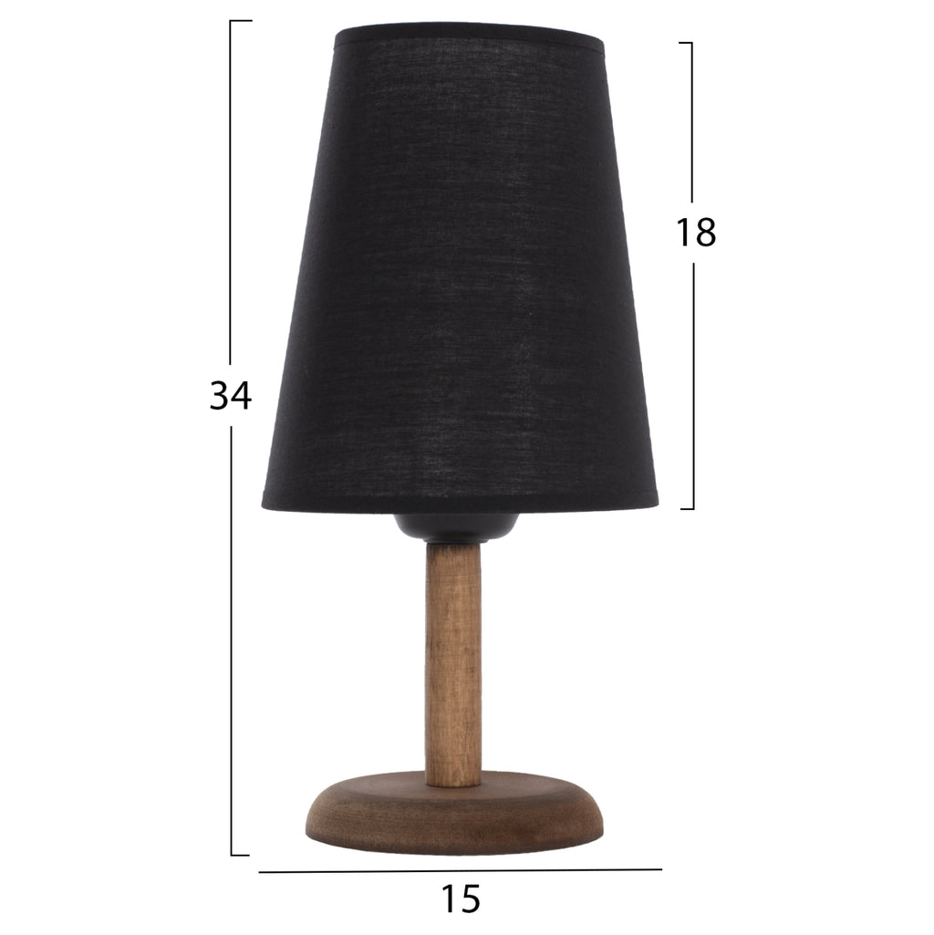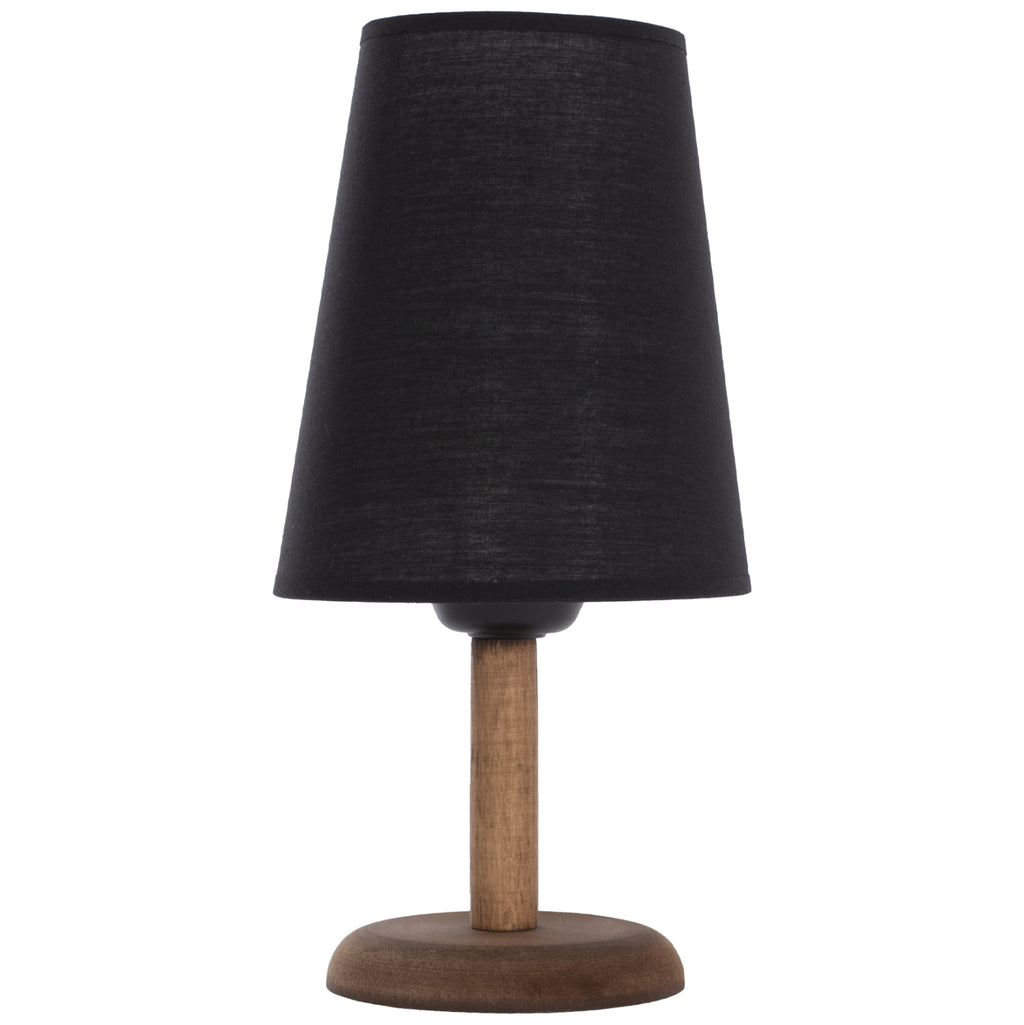 КГ7692.01---Декоративна настолна лампа с дървена кръгла основа и колона в цвят орех и цилиндрична "шапка" в черен цвят. "Шапката" е от плат и е доста дълга и тясна. Тези видове лампи не са предназначени за лампи за четене и това винаги трябва да се има предвид при избора им. Те са чисто декоративни и вписването им в околното пространство трябва да е хармонично. Тази лампа е семпла, елегантна и удобна като размери, предоставяща безброй възможности за "завързване" към останалата част от вашата декорация. Това е едно малко произведение на изкуството.