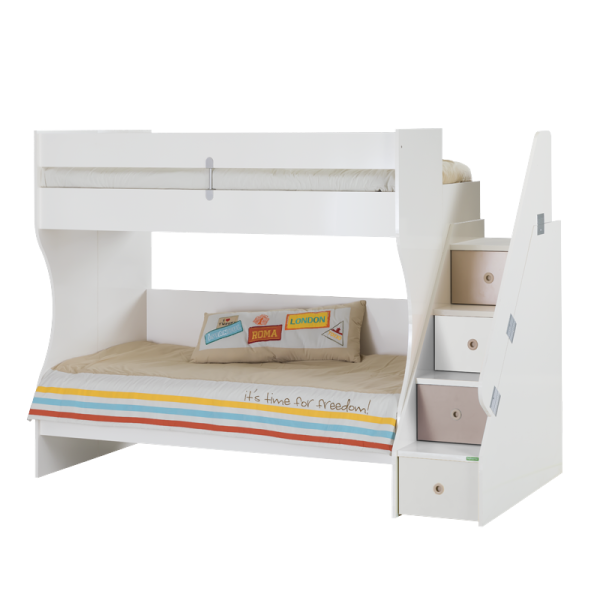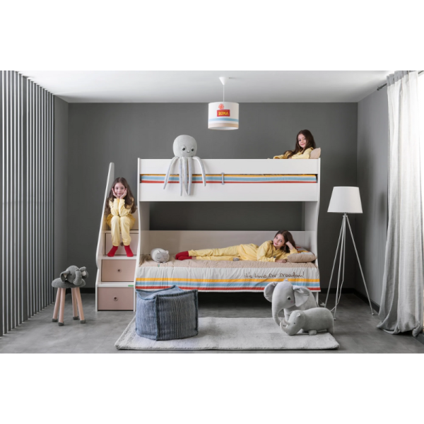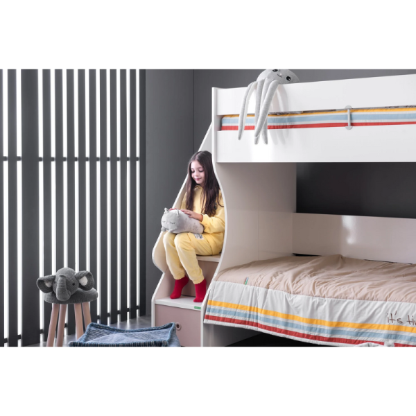 Двуетажното детско легло Joyin е изработено от висококачествено ПДЧ в бяло, което придава свеж вид и лесно се вписва във всяка детска стая. Конструкцията е проектирана за два матрака с размери 90 x 190 см, а стълбата може да се монтира както отляво, така и отдясно според особеностите на помещението. Под всяко стъпало о е разположено практично шкафче, което осигурява допълнително място за съхранение на спално бельо, дрехи или играчки. Подробности за размерите и характеристиките можете да намерите в раздел "Техническа информация".