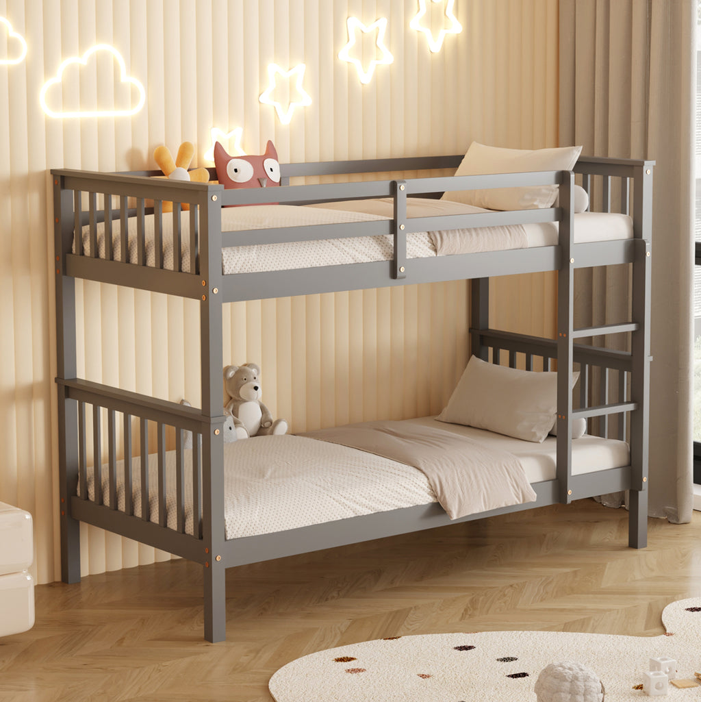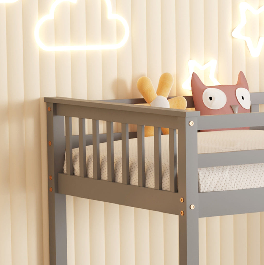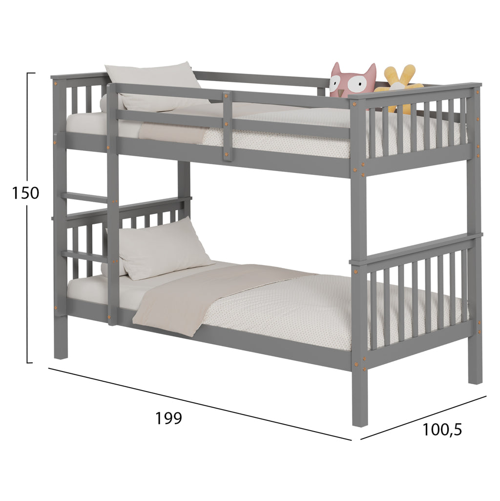 Представяме ви "LANTAI" което е ново двуетажно детско двуетажно легло. Леглата са с размери за еднолицев матрак 90х190 см, и са отлично качество, модерен и безопасен избор за детската стая. Двуетажното легло е дървено в СИВ цвят боядисано с безвреден и нетоксичен лак на водна основа, идеално за деца. Матраците са поставени върху дъски от шперплат. Има красива стълба за достъп до горното легло, както и защитни решетки около горното легло, докато краката са сравнително високи, оставяйки място за съхранение и лесно почистване. Но това, което отличава това двуетажно легло е, че ви позволява да използвате двете легла отделно и не непременно като двуетажно! РАЗМЕРИ: 199x100.5x150H см. МАТЕРИАЛ ЗА ИЗРАБОТКА: Леглото е изцяло изработено от масивна борова дървесина. Борът е мека, бяла или бледожълта дървесина, която е лека на тегло с прави влакна и е устойчива на свиване, подуване и огъване. ПОДДРЪЖКА: За лесно почистване използвайте влажна кърпа и избършете всички повърхности. Не използвайте силни избелващи средства. *Продуктът се доставя несглобен във фабрична опаковка **Точното цветопредаване на продукта може леко да се различава от действителния продукт поради различните настройки на всеки монитор. ***Двуетажното легло не включва матраци