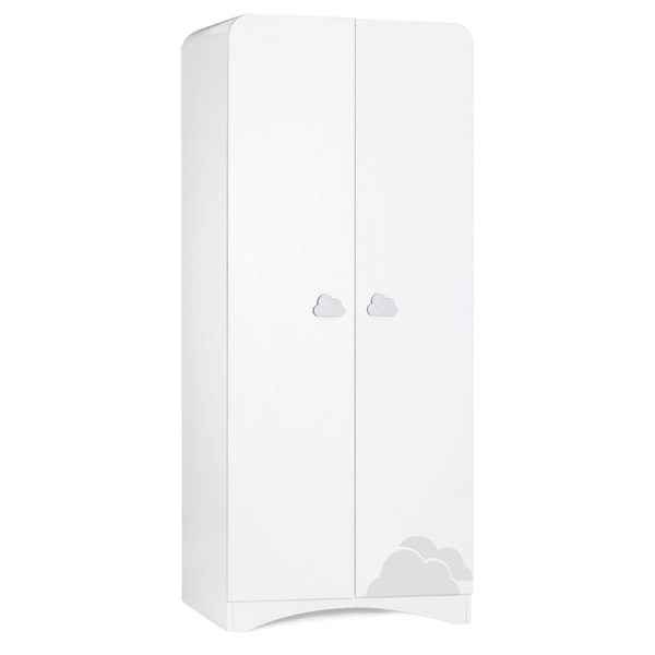 Двукрилен детски гардероб PORI съчетава стил и функционалност, като внася нежно усещане в детската стая с ефектните си облачни дръжки и деликатни принтове. Благодарение на големия вътрешен обем, той предлага достатъчно място за удобно съхранение на бебешки дрешки, аксесоари и всичко необходимо за ежедневната грижа. Гардеробът разполага както с отделение с лост за закачалки, така и с рафтове за подредба. Всяка от вратите е снабдена с механизъм за плавно затваряне, който осигурява безопасна и тиха употреба.