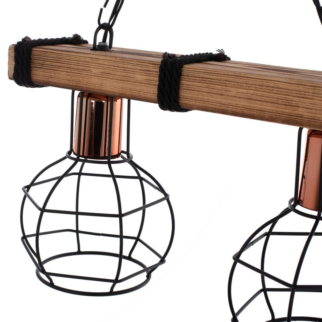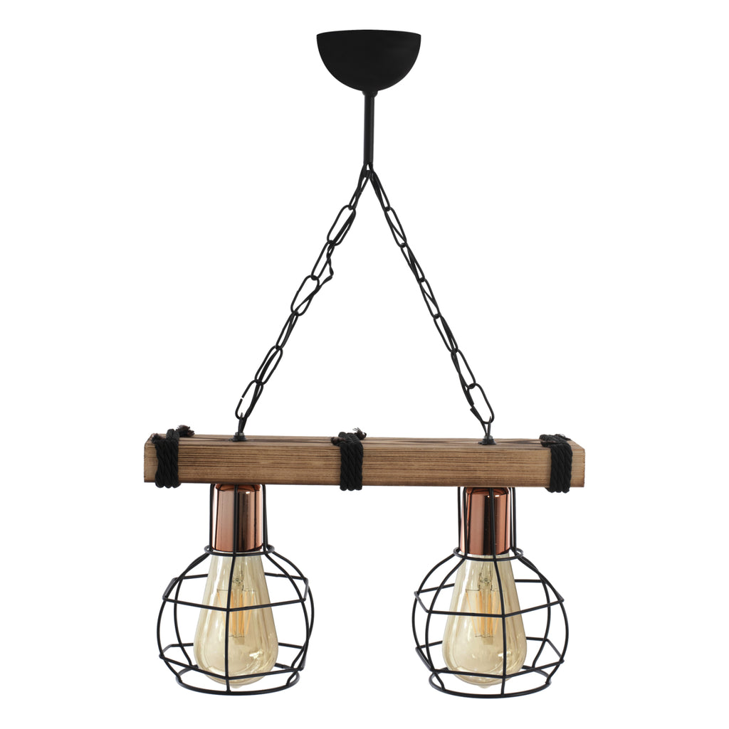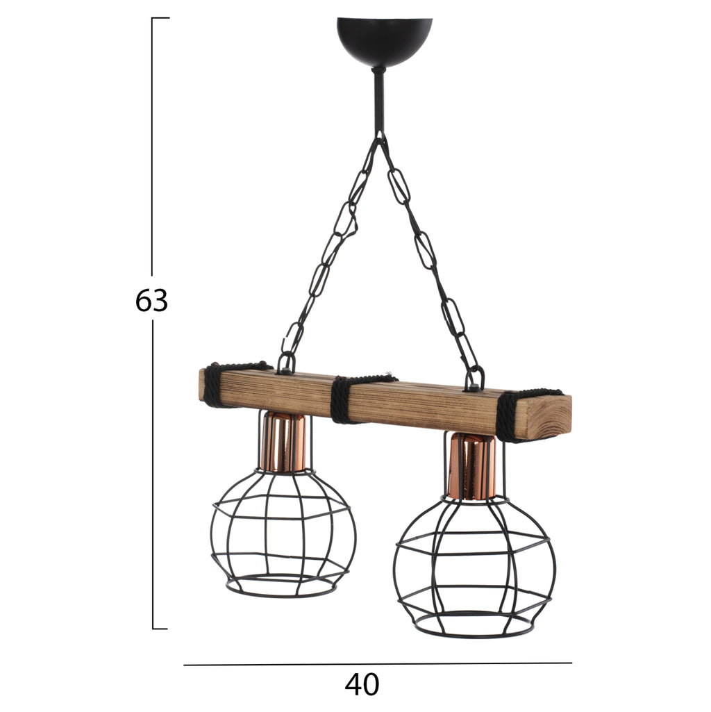 КГ7681.01-Таванна лампа -----Тази таванна лампа с две светлини уникално съчетава рустик стила с индустриалната естетика, която се предава от черните метални сферични решетки върху капаците на лампите. Цялата композиция е окачена на тавана с верига, която първоначално държи на две места дървена дъска в естествен цвят, под която са окачени металните решетки. Тази впечатляваща лампа ще придаде съвсем различен вид на вашето пространство и ще приковава окото! ТЕХНИЧЕСКИ ХАРАКТЕРИСТИКИ: Цокъл на крушката: E27 Цокъл с обикновена крушка Тип на крушката: Препоръчително е да се използва LED Размери: 40x9-16x63H cm. КОНСТРУКТИВЕН МАТЕРИАЛ: Сферичните решетки/капачки на лампата са метал с особена здравина. ПОДДРЪЖКА: Лампата се почиства лесно с влажна кърпа. Избягвайте използването на химически почистващи препарати. ПРЕДИМСТВА: Това е красива лампа с уникална естетика и външен вид. Естественият цвят на дървото и черната метална мрежа се съчетават чудесно и грабват окото, но в същото време изискват специална декоративна съгласуваност, за да подчертаят напълно естетическите достойнства на лампата. „Шапките“ позволяват на светлината да се разпръсне във всички посоки, което прави лампата идеална за множество пространства. Продуктът се доставя разглобен във фабрична опаковка