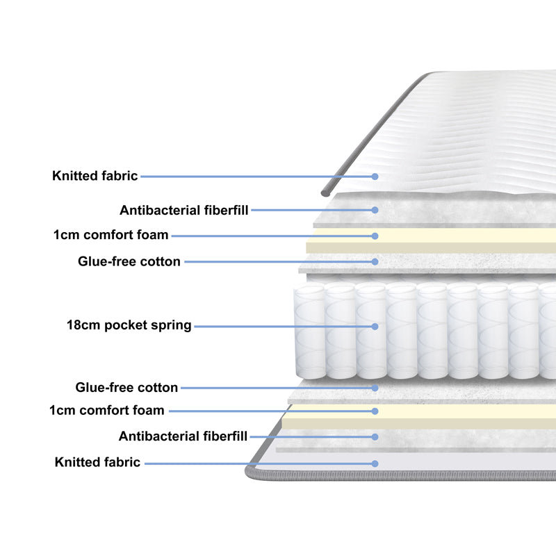 - Джобна пружина 18 см: Поддържащо ядро, изработено от независими джобни пружини, високи 18 см, изработени от стоманена тел с дебелина 1,8 мм. Подсилено с два външни реда тел с дебелина 2,2 мм за подобрена стабилност. Минимизира предаването на движение, така че няма да бъдете обезпокоявани от движенията на партньора си.