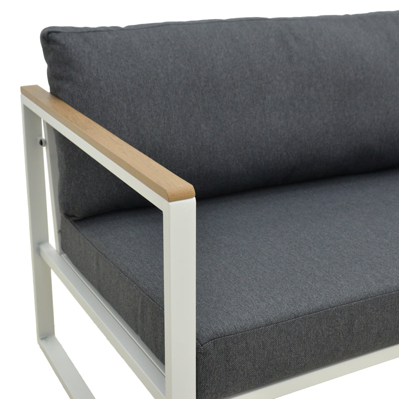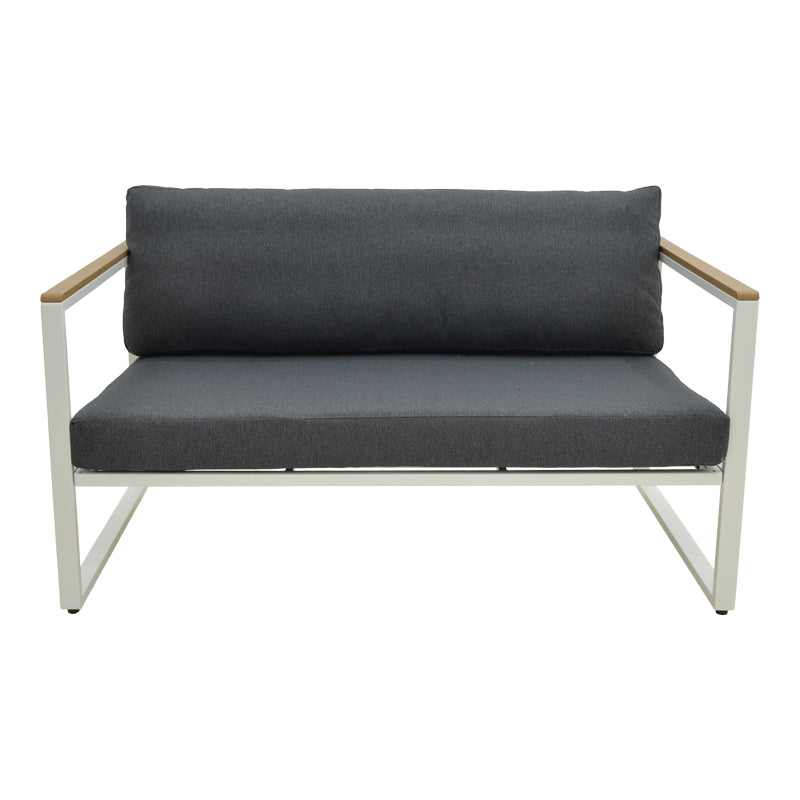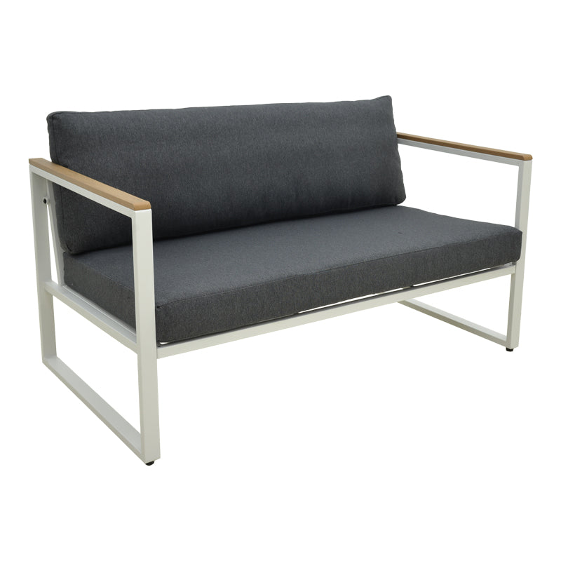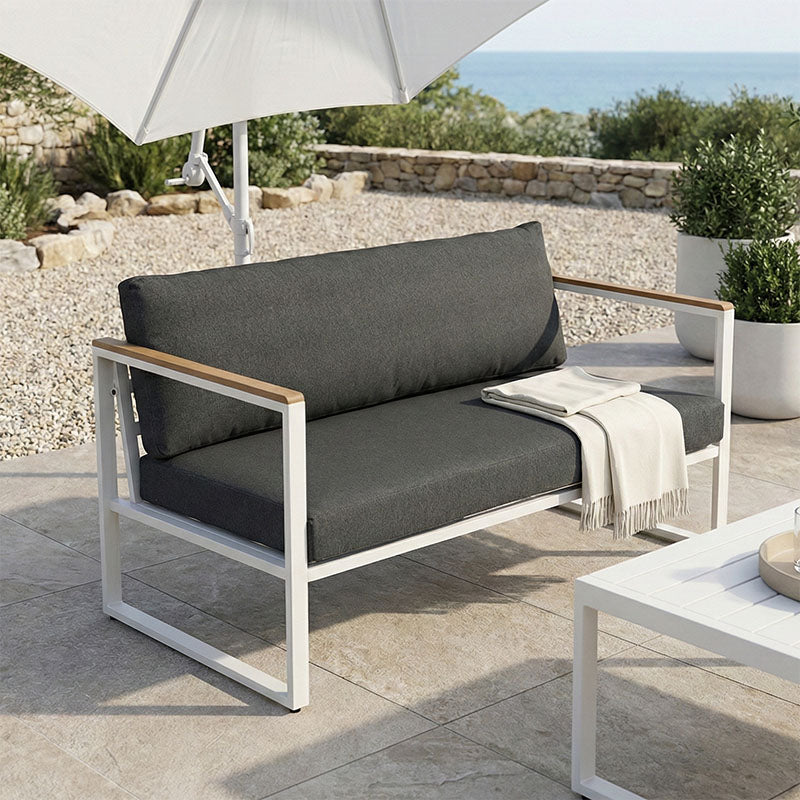 Подобрете вашето вътрешно или външно пространство с двуместния диван Aurelio. Със здрава стоманена рамка и елегантни, модерни линии, той съчетава стил, комфорт и дълготрайна издръжливост. Подлакътниците с акценти от шперплат добавят естествен щрих, а плюшените възглавници осигуряват първокласно изживяване при сядане.