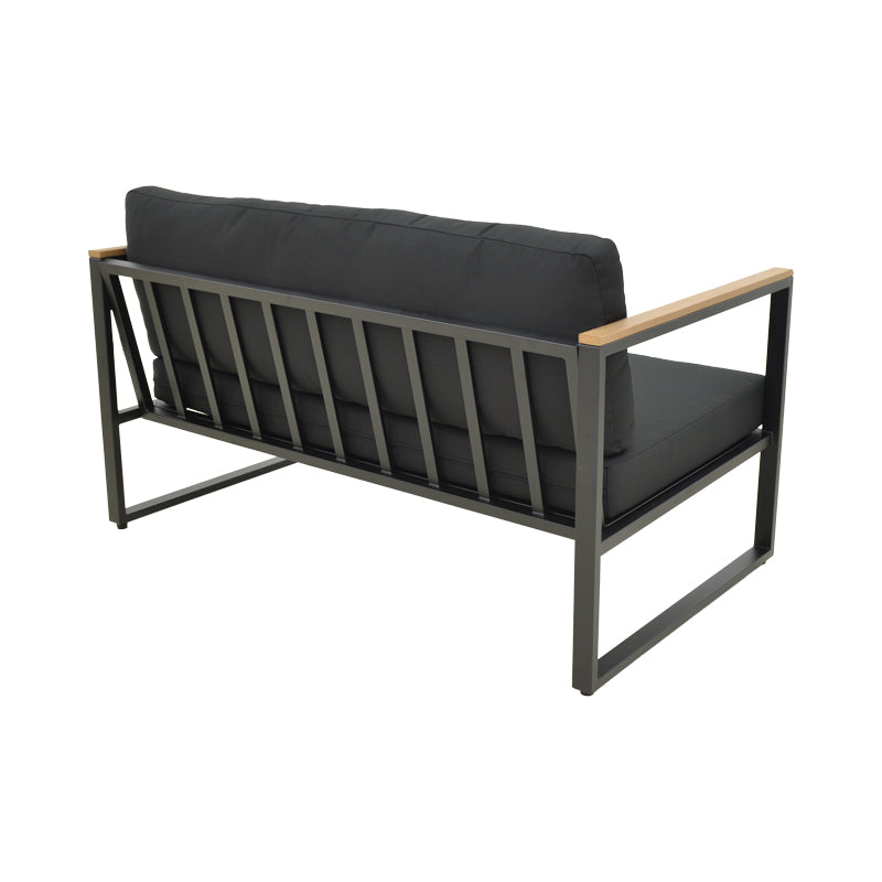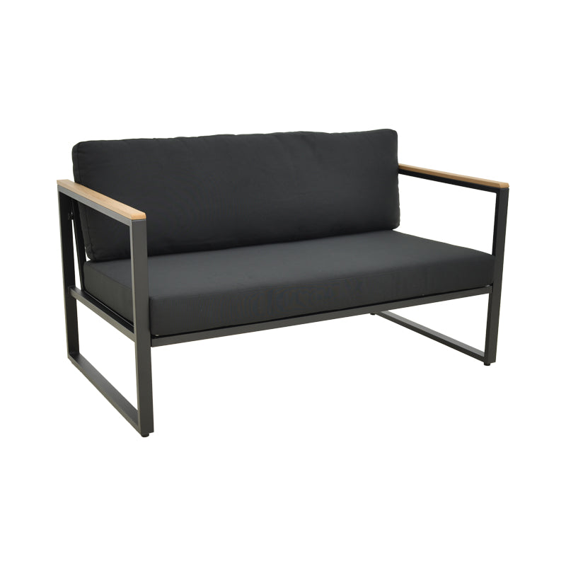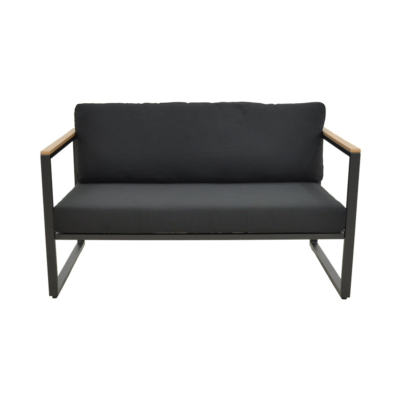 Подобрете вашето вътрешно или външно пространство с двуместния диван Aurelio. Със здрава стоманена рамка и елегантни, модерни линии, той съчетава стил, комфорт и дълготрайна издръжливост. Подлакътниците с акценти от шперплат добавят естествен щрих, а плюшените възглавници осигуряват първокласно изживяване при сядане.